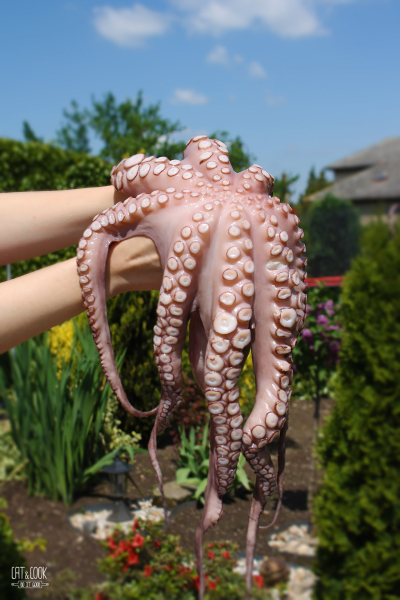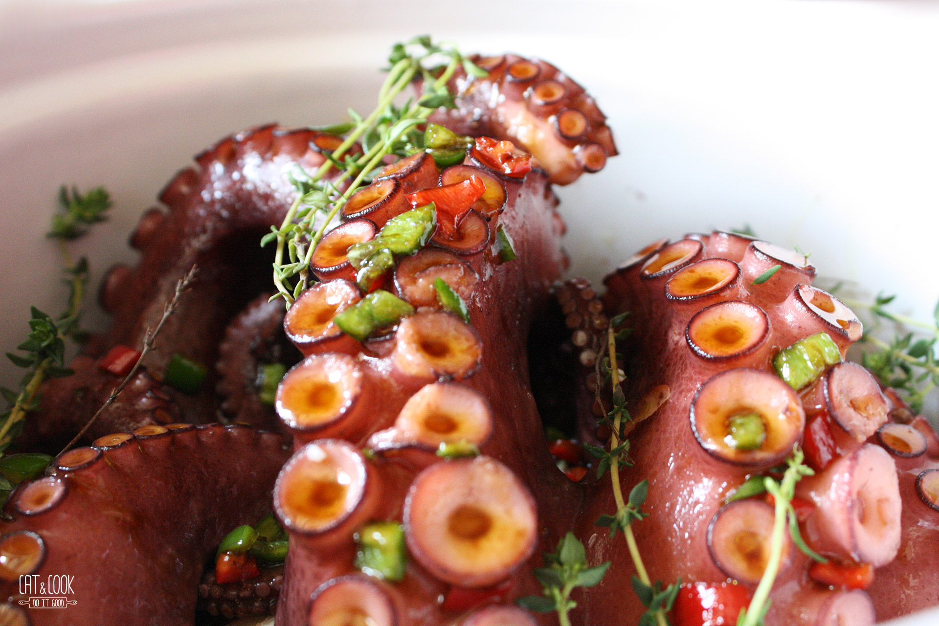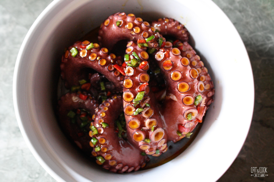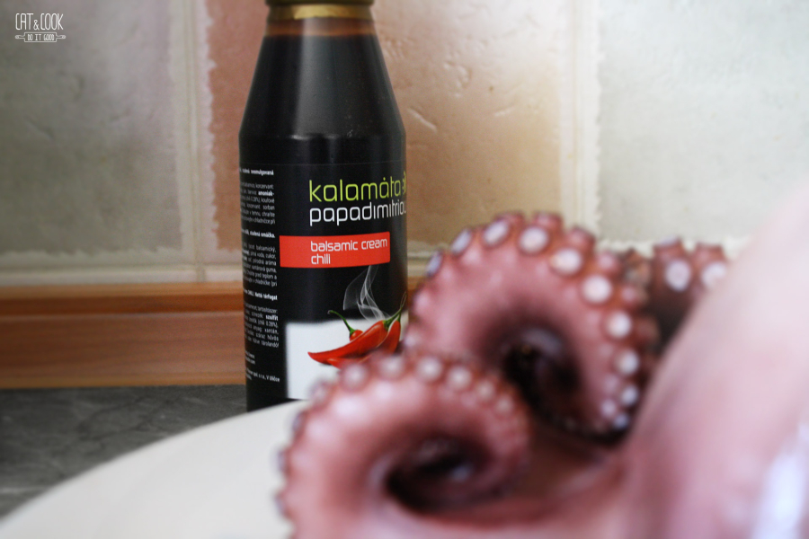 Poté ji vyndej na prkýnko, odkroj hlavu a nakrájej na jednotlivá chapadla. Vlož do marinády. Marinádu si lehce připrav smícháním olivového oleje, chili balsamic cream Kalamáta Papadimitriou, najemno nasekaných chilli papriček, tymiánu, soli a pepře. Nech 30 minut na kuchyni a poté přiklop a dej do lednice ideálně přes noc, ale postačí 2 hodiny.
