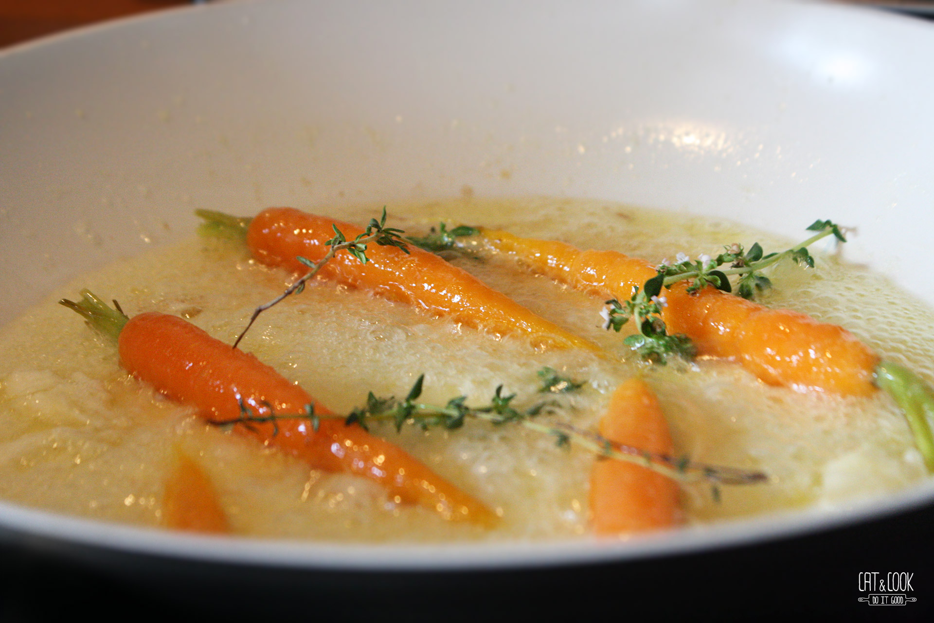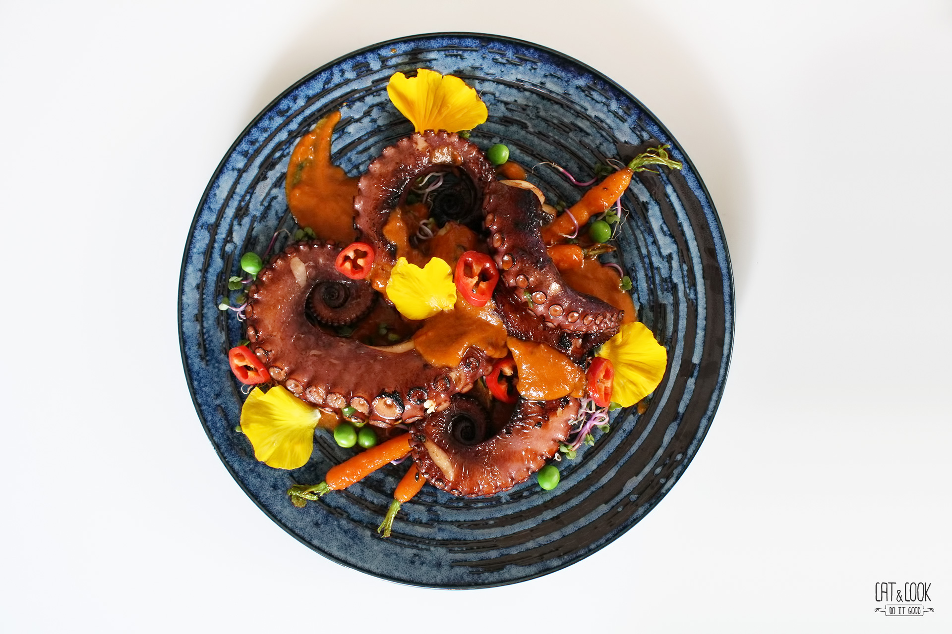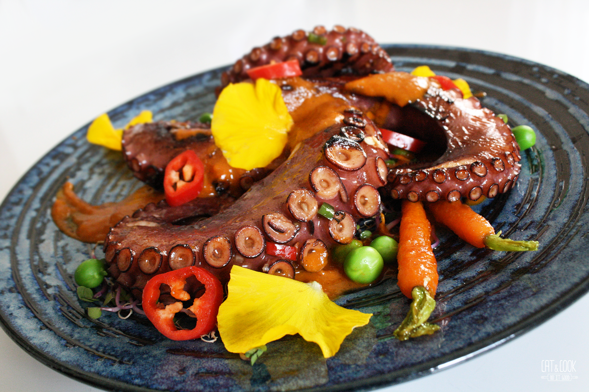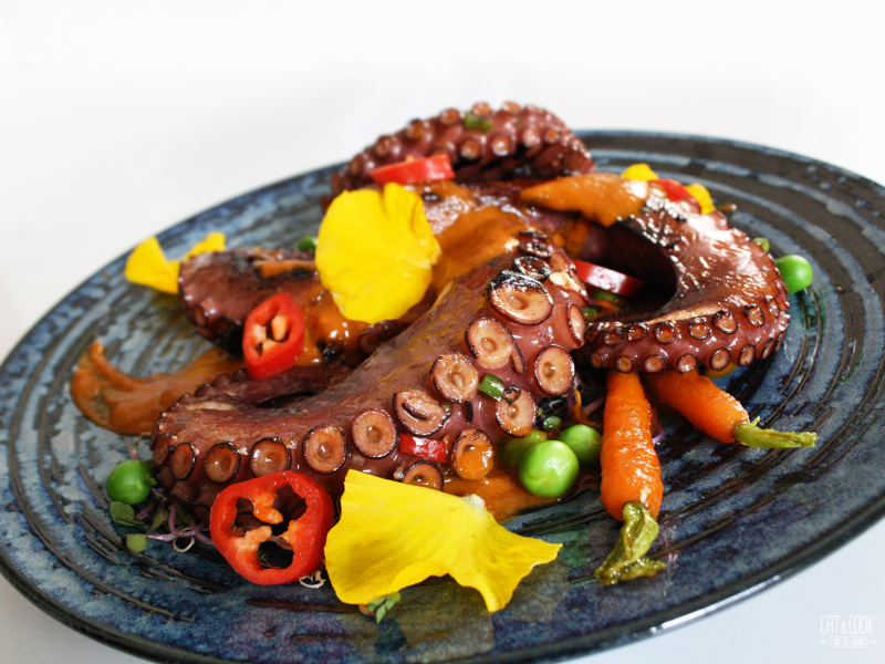 Chobotnici servíruj na talíř společně s omáčkou a jarní zeleninkou, já jsem přidala glazurovanou mladou mrkvičku a blanšírovaný hrášek. Můžeš přidat i listy špenátu, rukolu či jiný oblíbený salát.