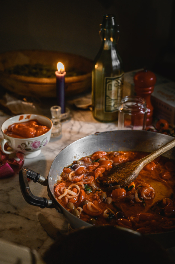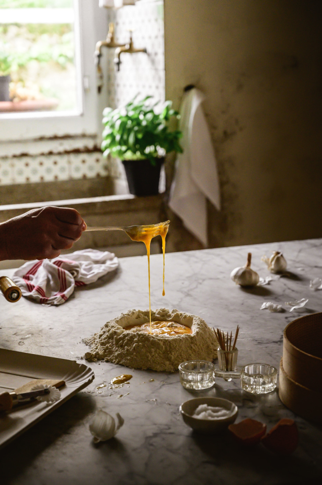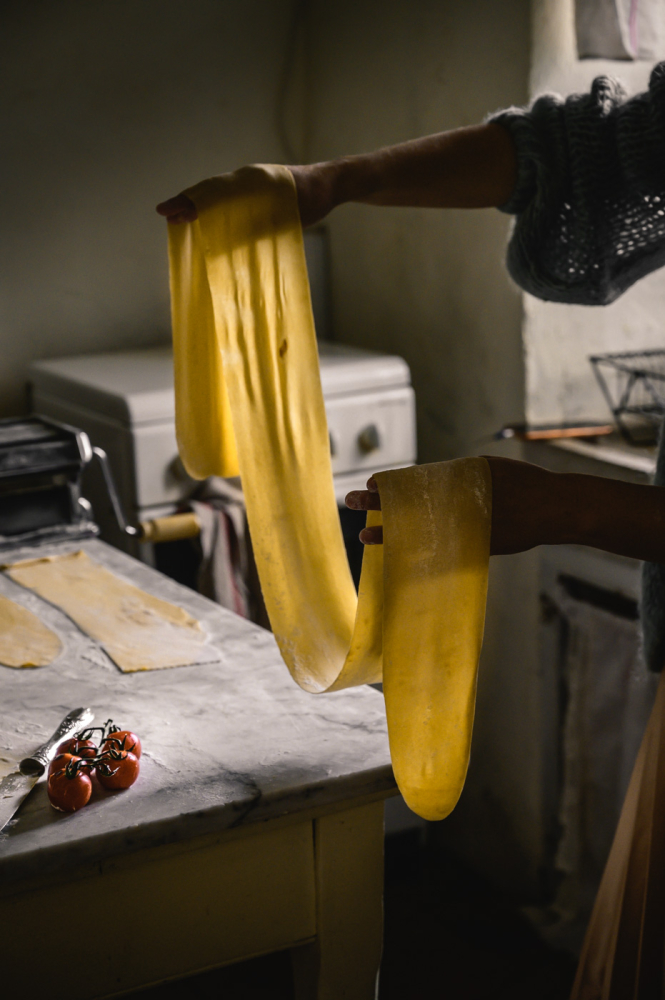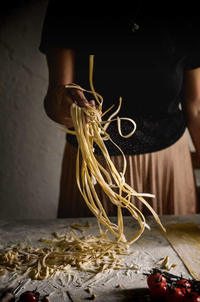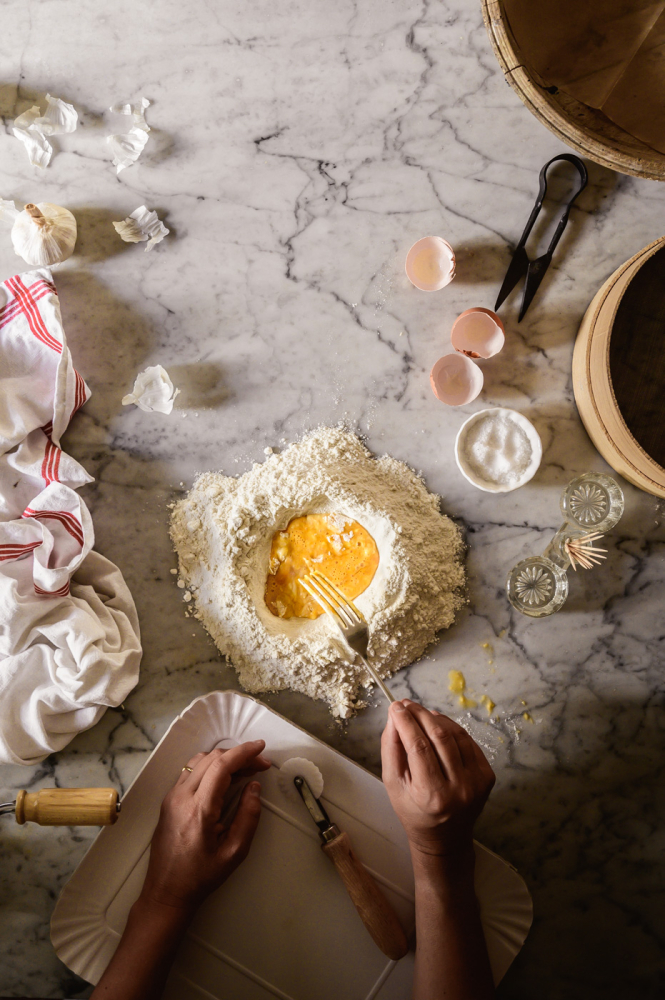 Druhý den byl zahájen tématem, na které jsem se těšila úplně nejvíc! Byla to fotografie a styling pro storytelling. Aneb nejen postupové fotografie u receptu. Jedná se v podstatě o komplexního pocit z fotky, který máte, když na ni koukáte. Je to ale těžká disciplína vám povím. Teorii jsme opět dostaly v lejstrech, praxe spočívala v přípravě domácích těstovin. Ježíši, to bylo tak skvělý! Nejdříve jsme se bavily o kompozici, holky nám vysvětlily nějaké zásady a pak se šlo na věc. Každá z účastnic si povinně vyfotila všechny kroky přípravy. Po jednotlivých fotkách vždy následovala konzultace vlastní fotky s holkama, ale i účastnicemi. Bylo to opravdu šíleně inspirativní, jak každá z nás to jídlo viděla trochu jinak, z jiného úhlu atd. Holky nám přitom radily a fotily taky, aby nám ukázaly, jak to má ideálně vypadat. Pomohly mi třeba i s nastavením foťáku, úpravou ISO atd. Byla jsem totiž zvyklá fotit na úplně jiné nastavení, takže i tady jsem se přiučila. 🙂 Celou dobu jsem si navíc dělala zápisky, takže jsem měla hlavu jako pátrací balon.