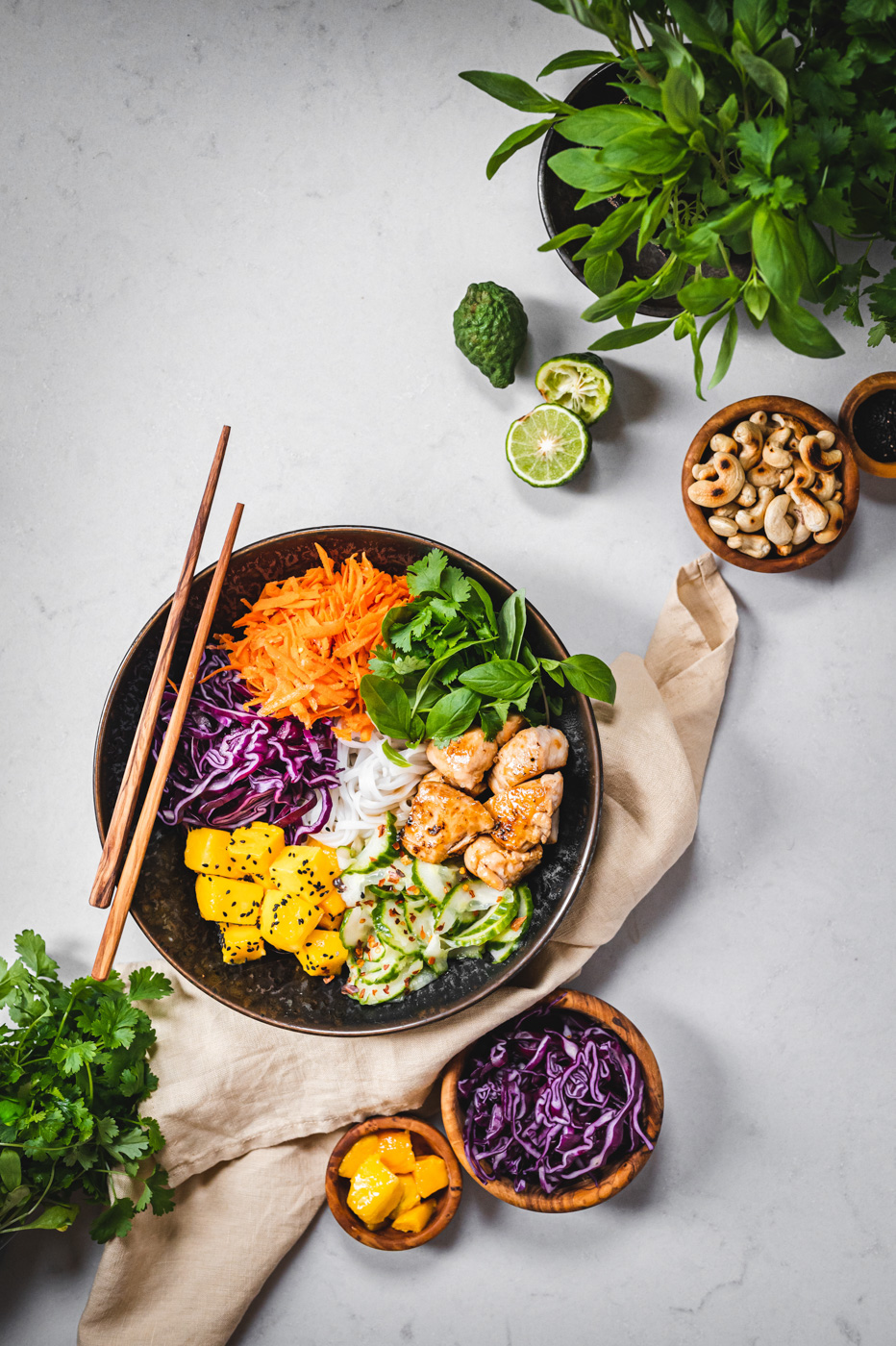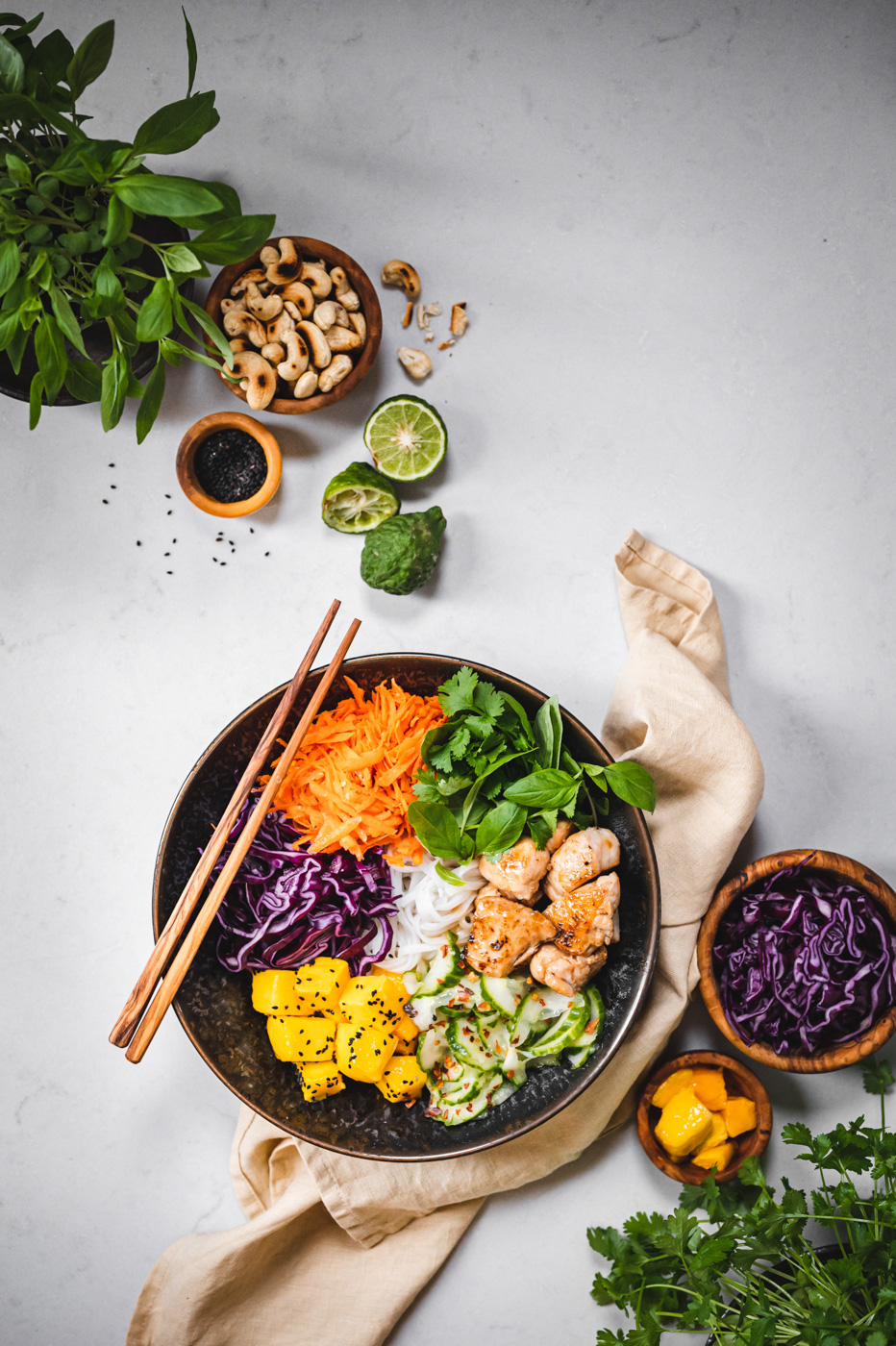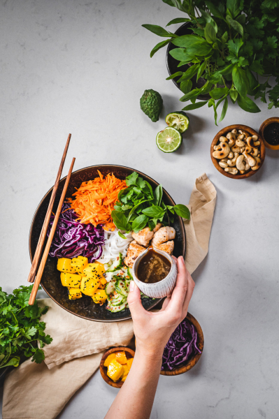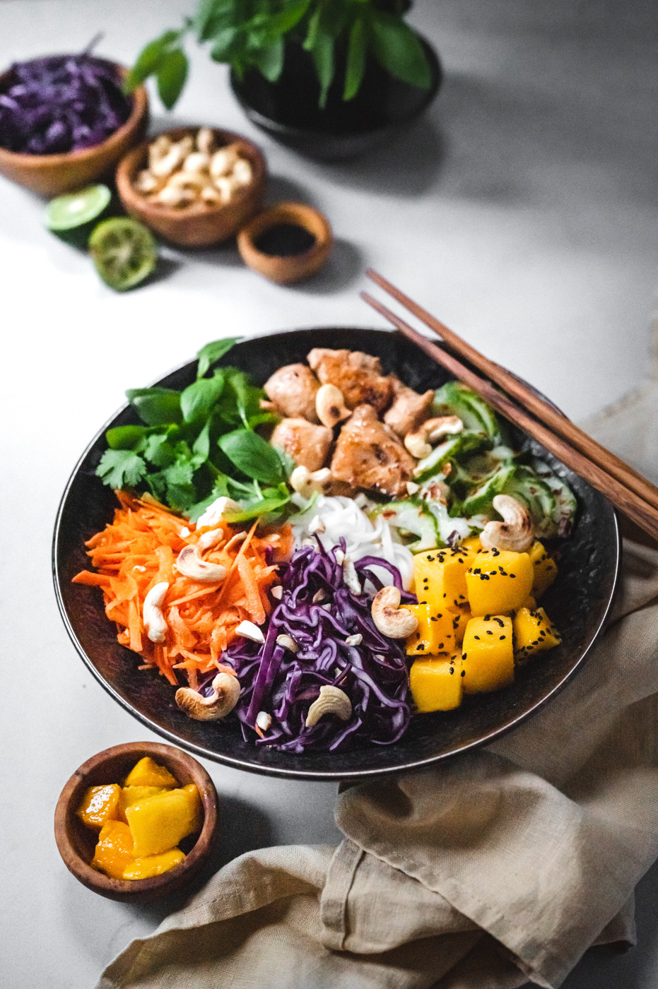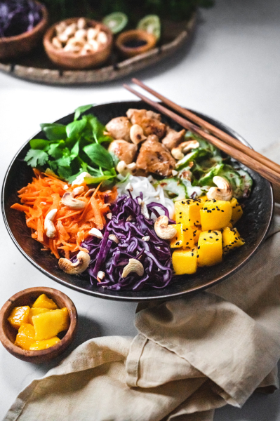 Do misky naskládejte maso, zeleninu (okurku servírujte bez většího množství zálivky, ve které se marinovala), mango (to posypte sezamem), cibulku a ozdobte bylinkami a oříšky. Zalijte zálivkou a podávejte. 🙂