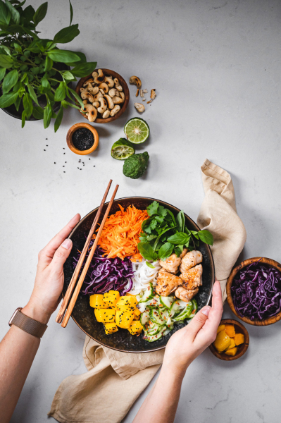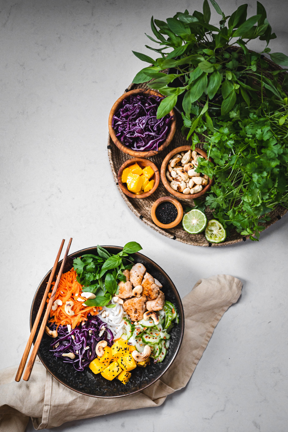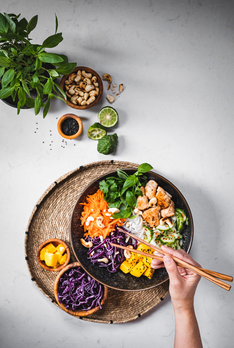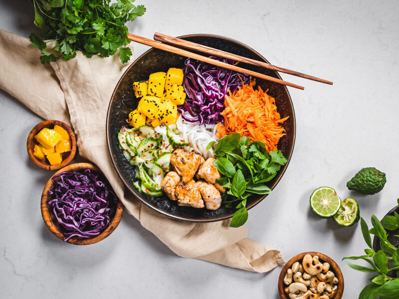 Do misky naskládejte maso, zeleninu (okurku servírujte bez většího množství zálivky, ve které se marinovala), mango (to posypte sezamem), cibulku a ozdobte bylinkami a oříšky. Zalijte zálivkou a podávejte. 🙂