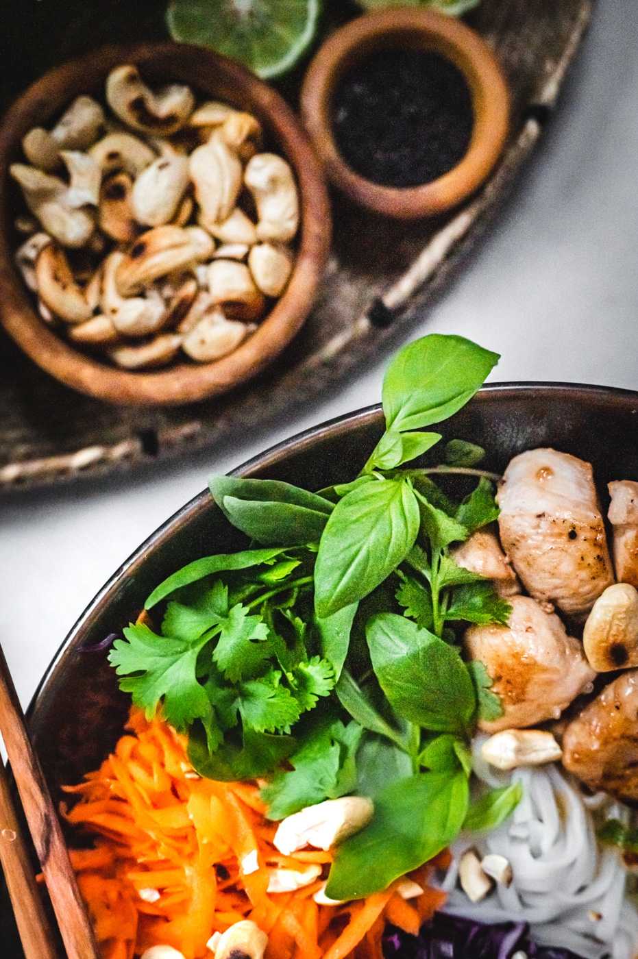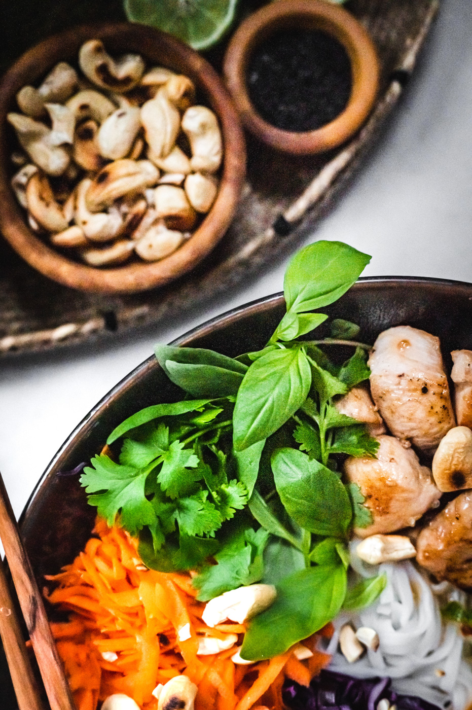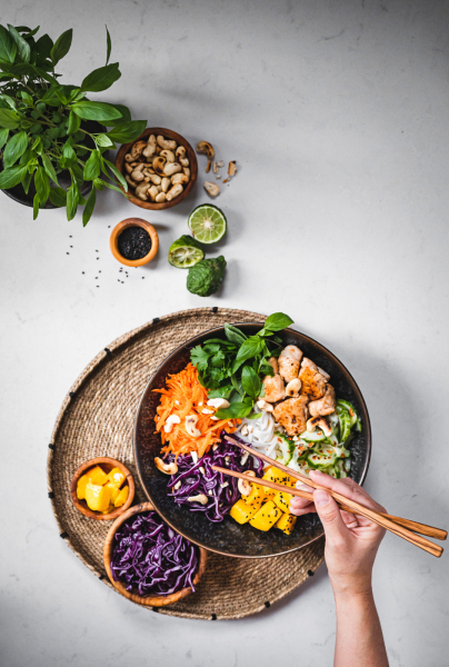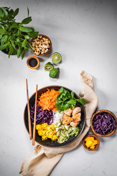 Vůbec jsem nevěděla, jak nazvat tenhle recept, nejdřív jsem ho chtěla pojmenovat anglicky „asian bowl“, ale nakonec vyhrál český název. 🙂 Je to zkrátka miska zeleniny, masa a nudlí se surovinami, které se používají především v různých zemích Asie. Od salátu se liší tím, že ingredience nejsou promíchané. Promíchat si je můžete až na talíři, a nebo ingredience míchat nemusíte a nabíráte si je postupně, jak vám přijdou k chuti. 🙂