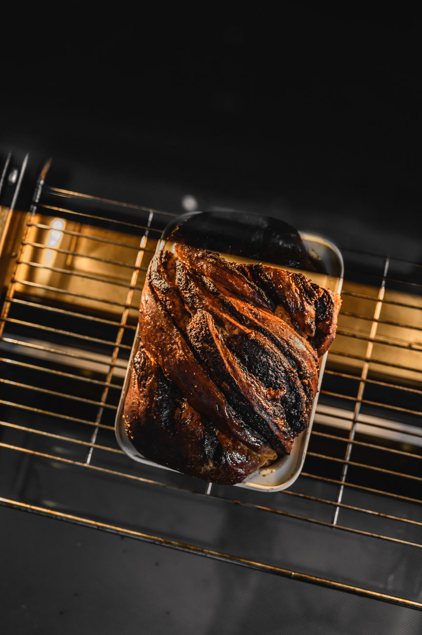 Formu na chlebíček vymažte máslem a vyložte pečícím papírem (po kratších stranách dávat papír nemusíte). Vzniklý copánek opatrně položte do formy (tak, aby řezné strany plné čokoládové náplně koukaly nahoru), přikryjte utěrkou a nechte pomalu kynout asi 45 – 60 minut nebo dokud nezdvojnásobí svůj objem.