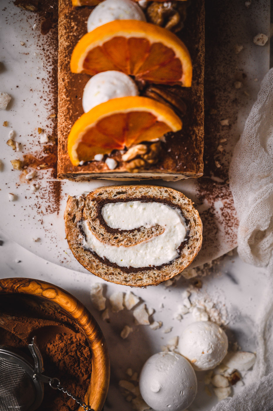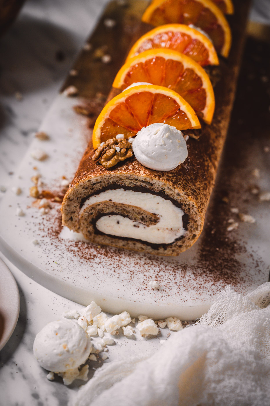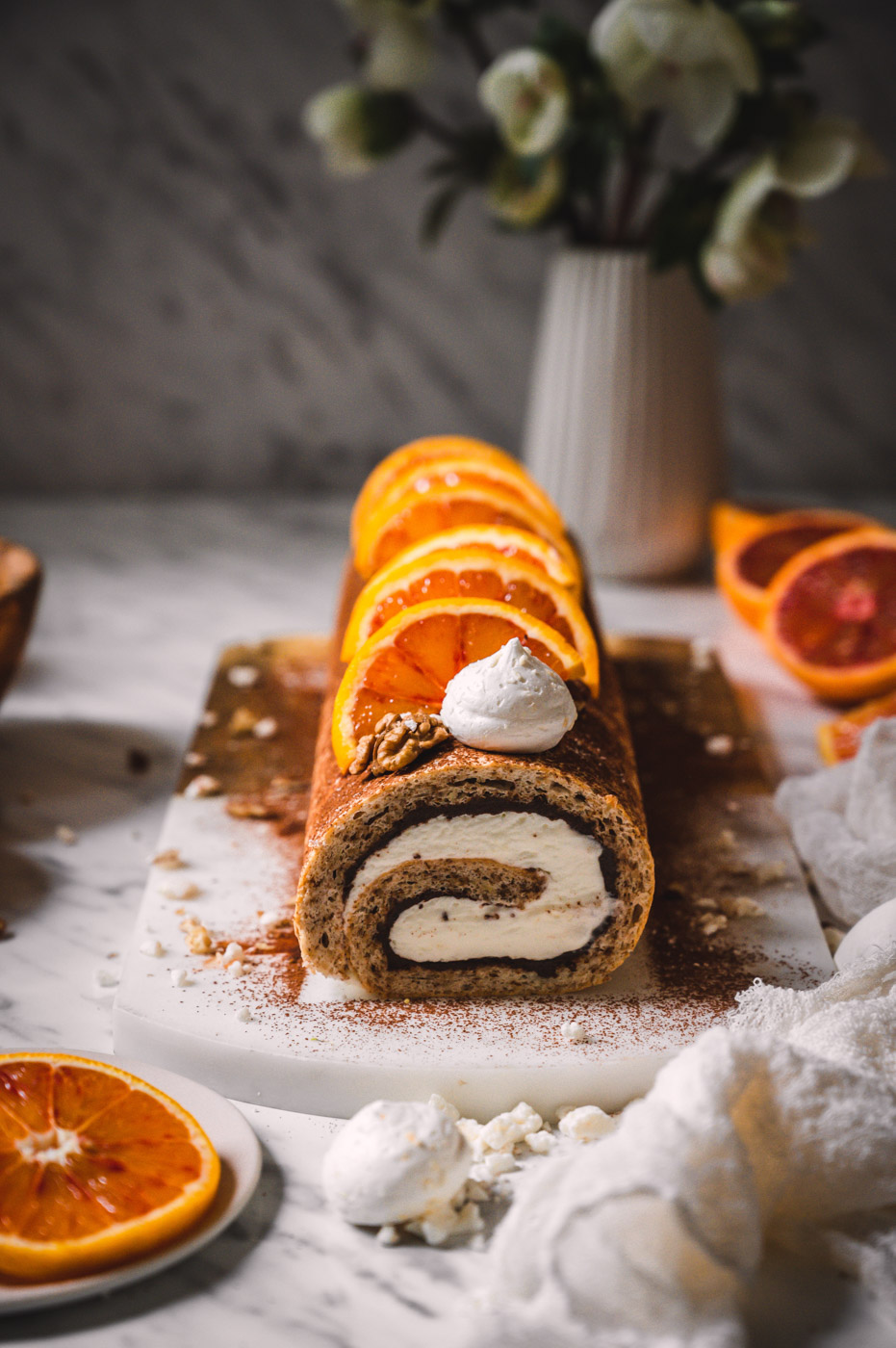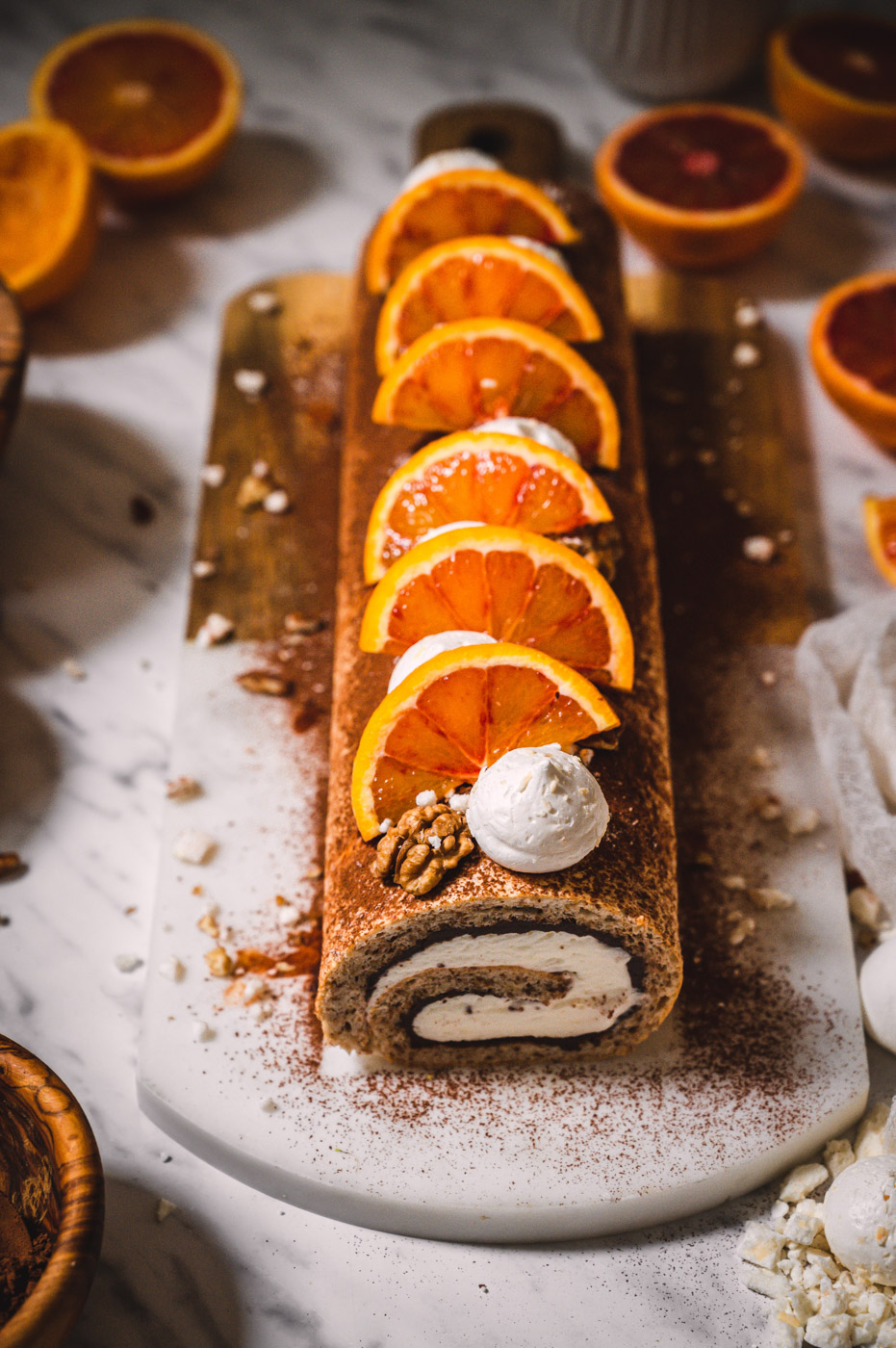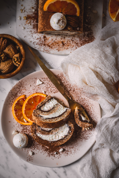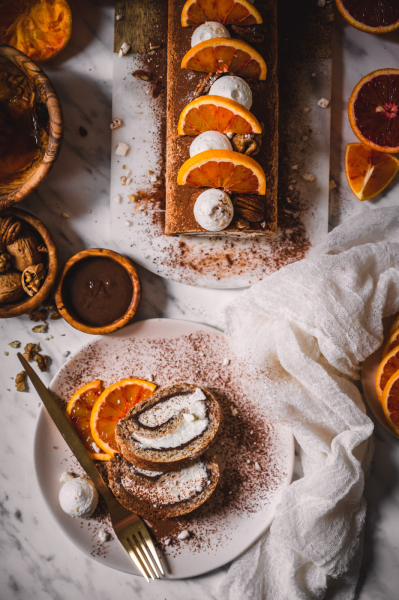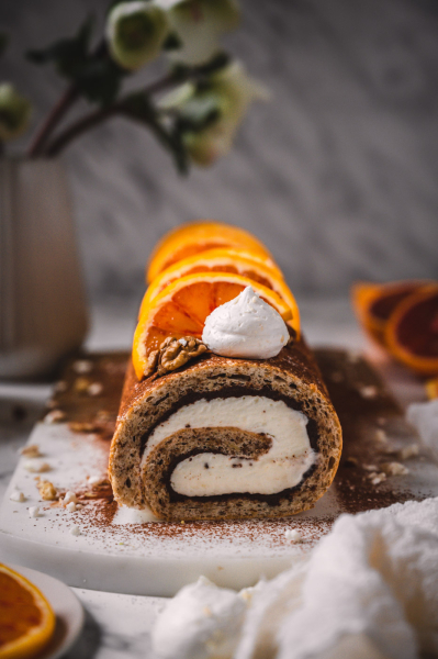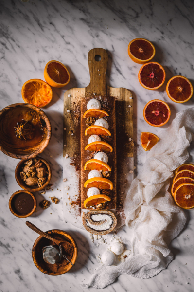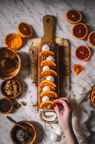 Pokud roládu pečete v zimě s pomeranči, rovnoměrně zakápněte korpus šťávou z ½ – 1 pomeranče (záleží, jak je šťavnatý, takže dejte na selský rozum – korpus chceme provonět, ne rozmáčet).