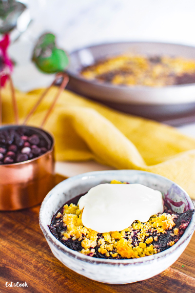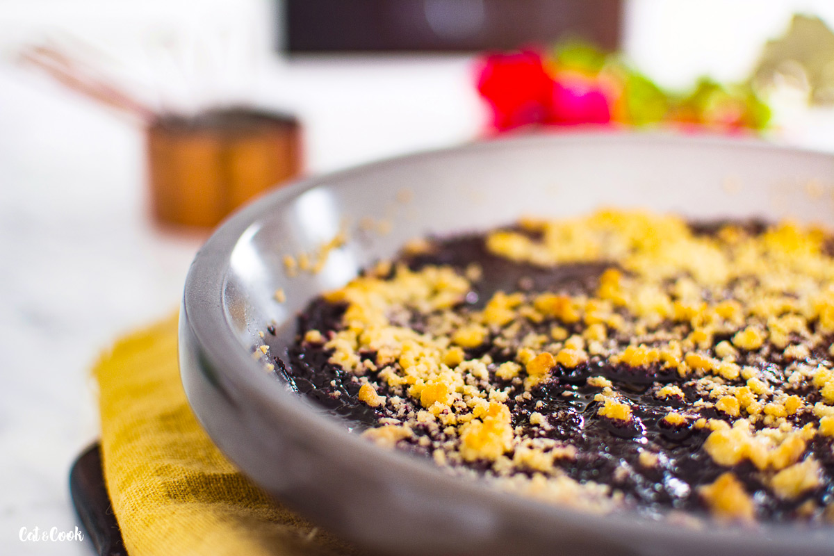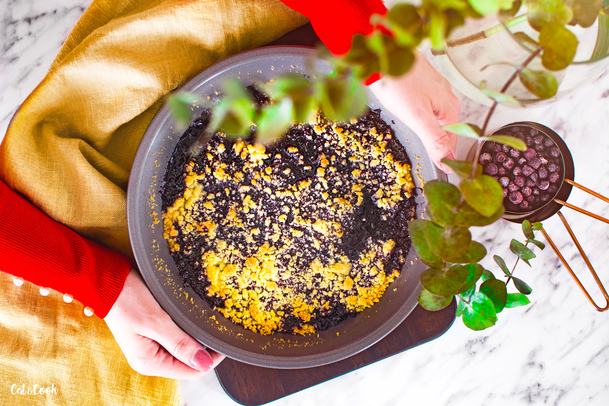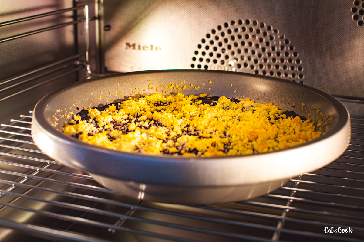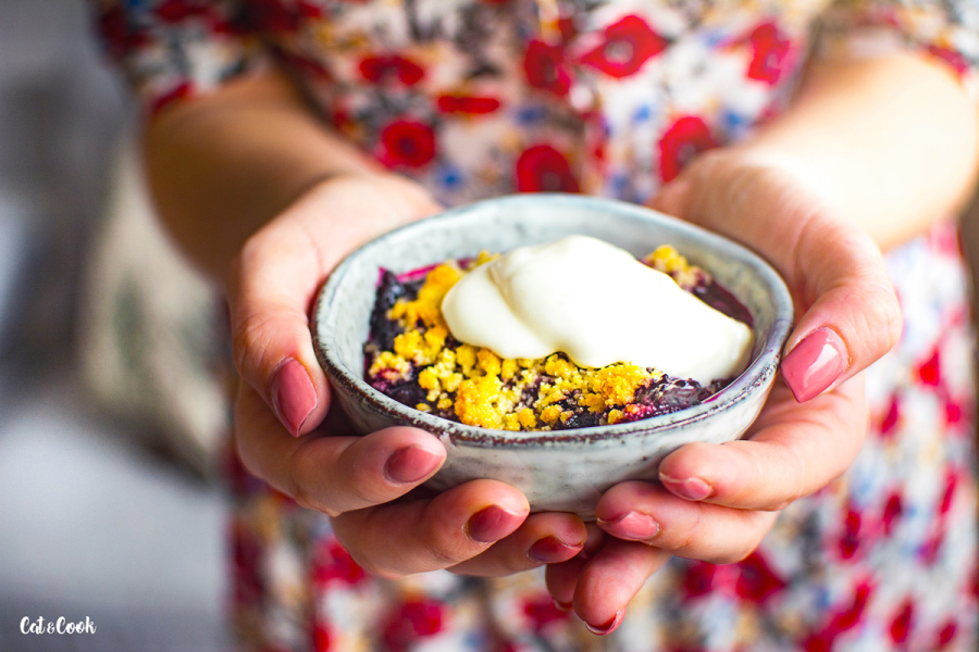 Že je váš crumble hotový poznáte díky krásně zlaté barvě drobenky a také díky krásně probublávajícímu ovoci mezi křupavou žmolenkou. Po vyndání z trouby nechte dezert lehce zchladnout a podávejte v mističkách se lžící smetany nebo kopečkem zmrzliny 🙂