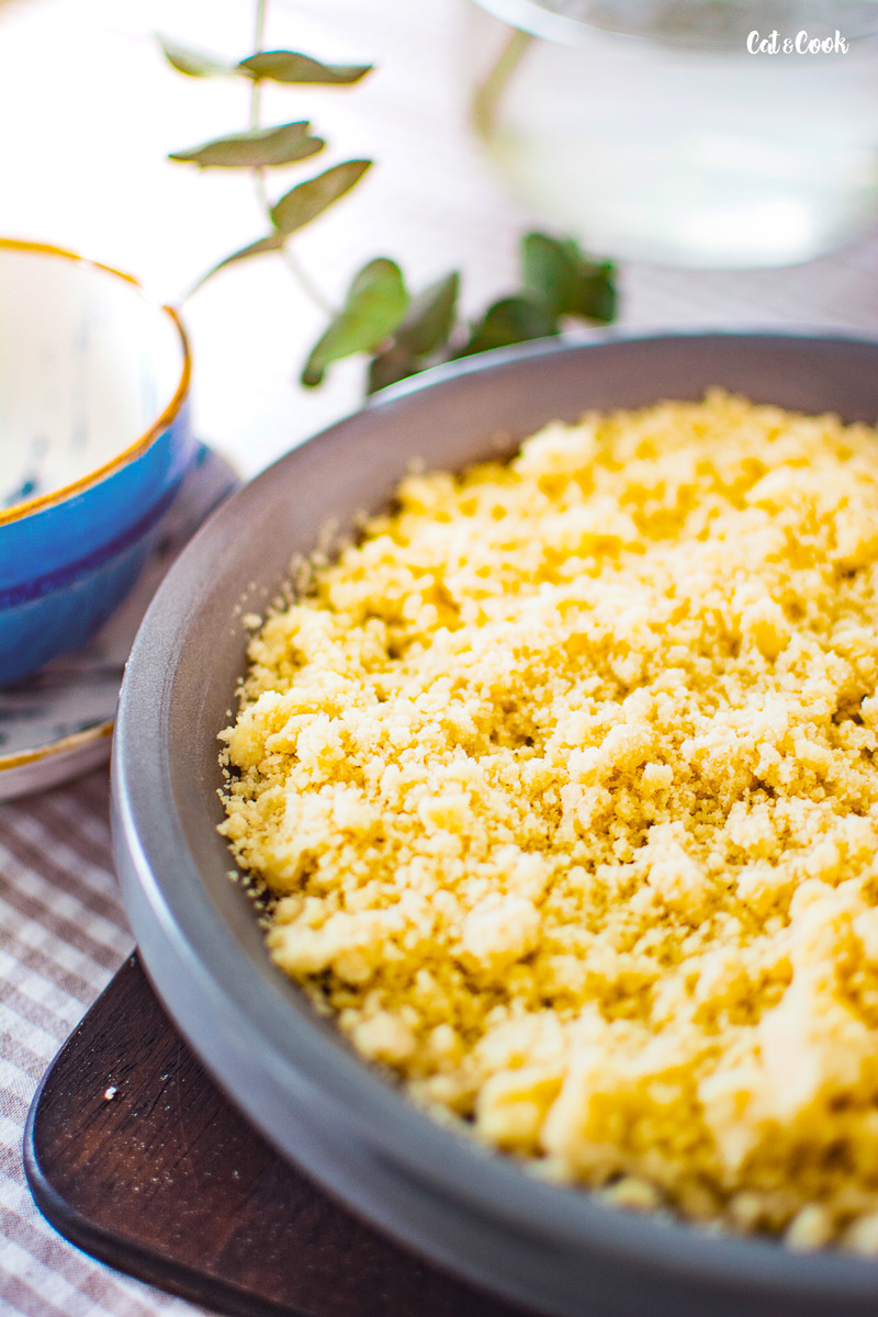 Tenhle báječnej dezert pochází z Anglie. V průběhu 2.světové války lidé neměli moc peněz na suroviny na klasický koláč s korpusem a tak vymysleli jednodušší a na mnžství surovin míň náročnější variantu. Díky Bohu za ty dary, je to opravdu bomba 🙂 Nejlepší na tomhle dezertu je množství variací a to jak ovoce, tak drobenky, kterou můžete připravit klasicky nebo ve zdravější formě. Já mám pro vás dneska recept na tu klasickou variantu 🙂