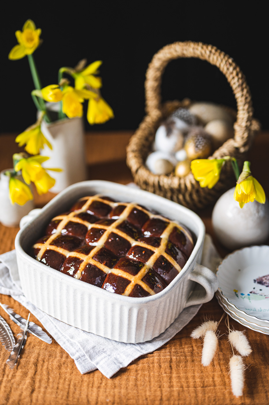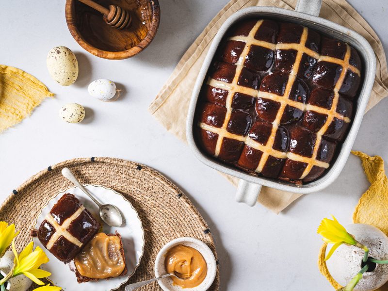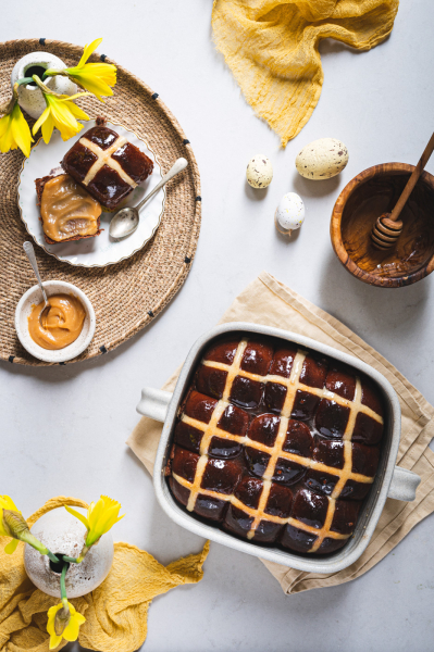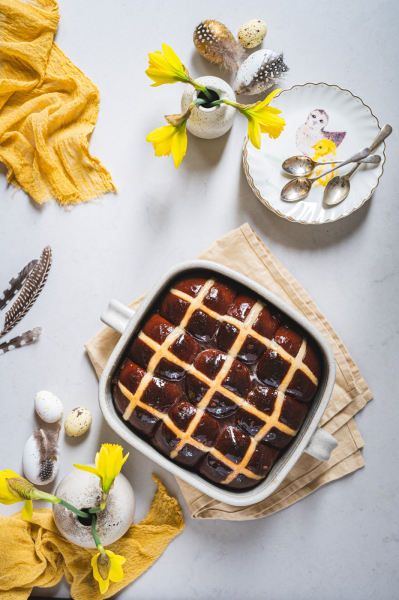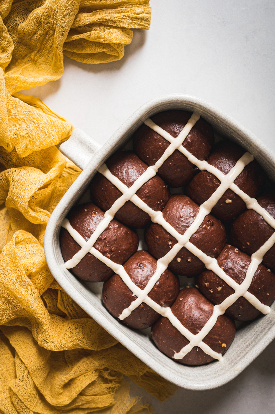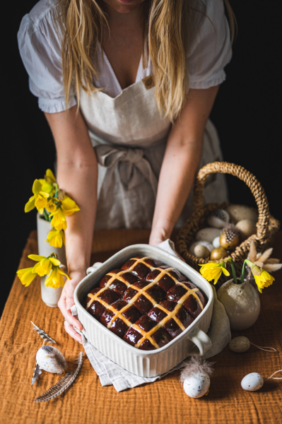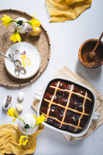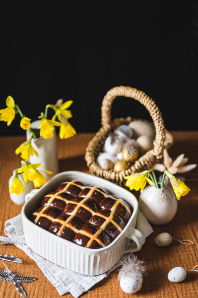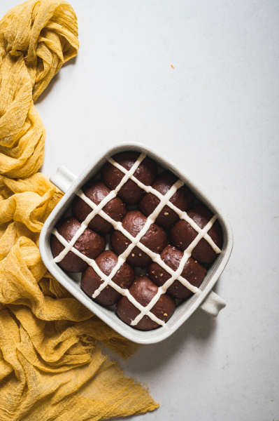 Hot cross buns jsou anglickou obdobou našeho mazance. Kříž na jejich povrchu má symbolizovat buď ukřižování, nebo měsíc rozdělený na čtvrtky. Tradičně se tyhle bochánky podávají na Velký pátek a nejlepší jsou za tepla, proto také mají v názvu „hot“. 🙂 Já jsem vymyslela čokoládovou variantu a jsem zvědavá, co na ni povíte! 🙂