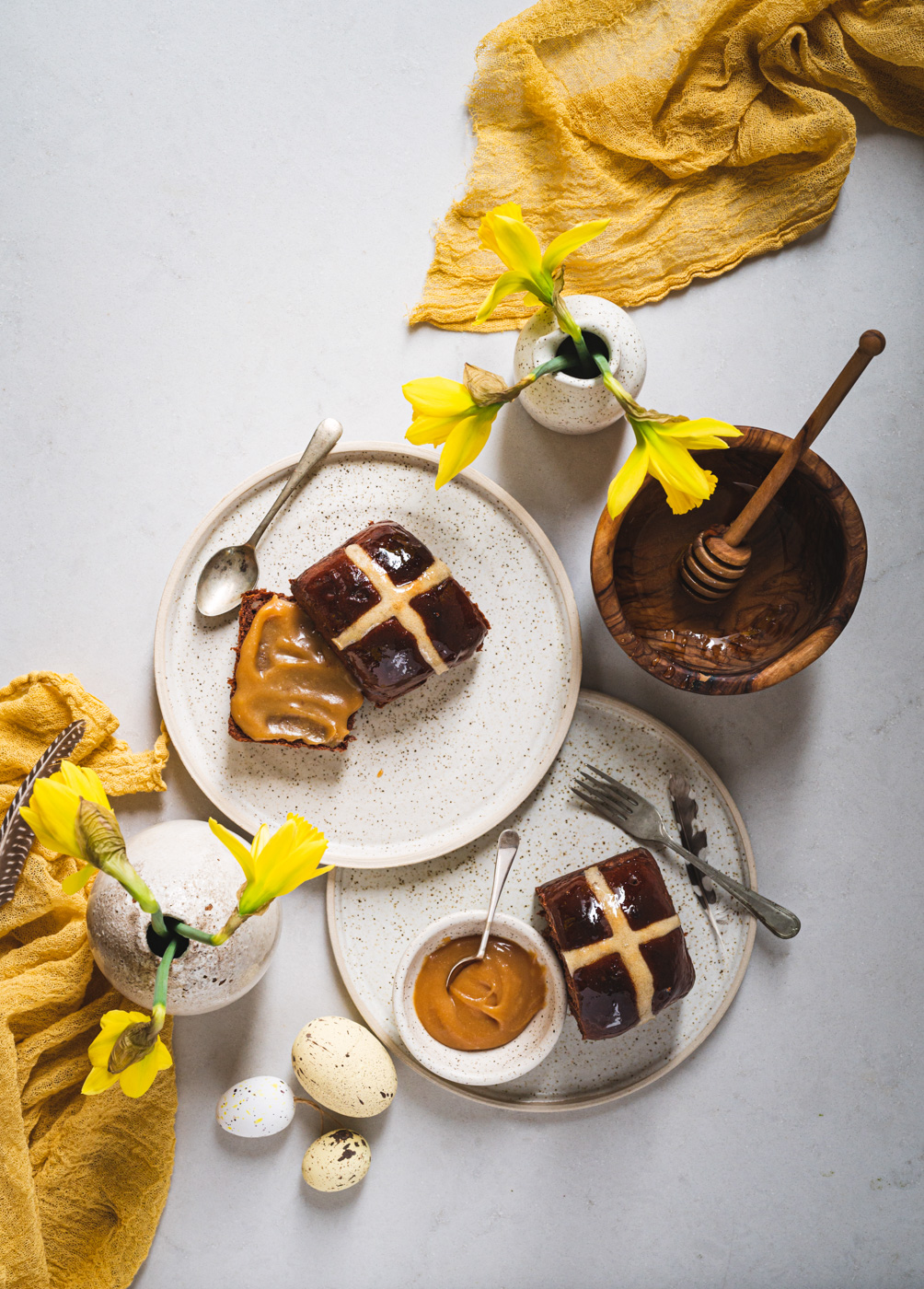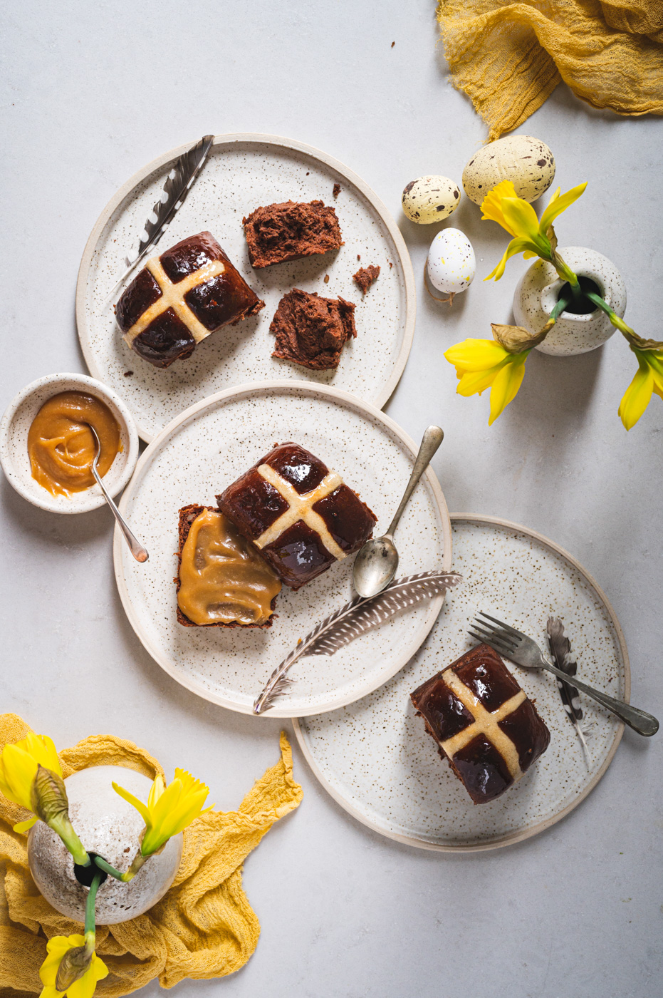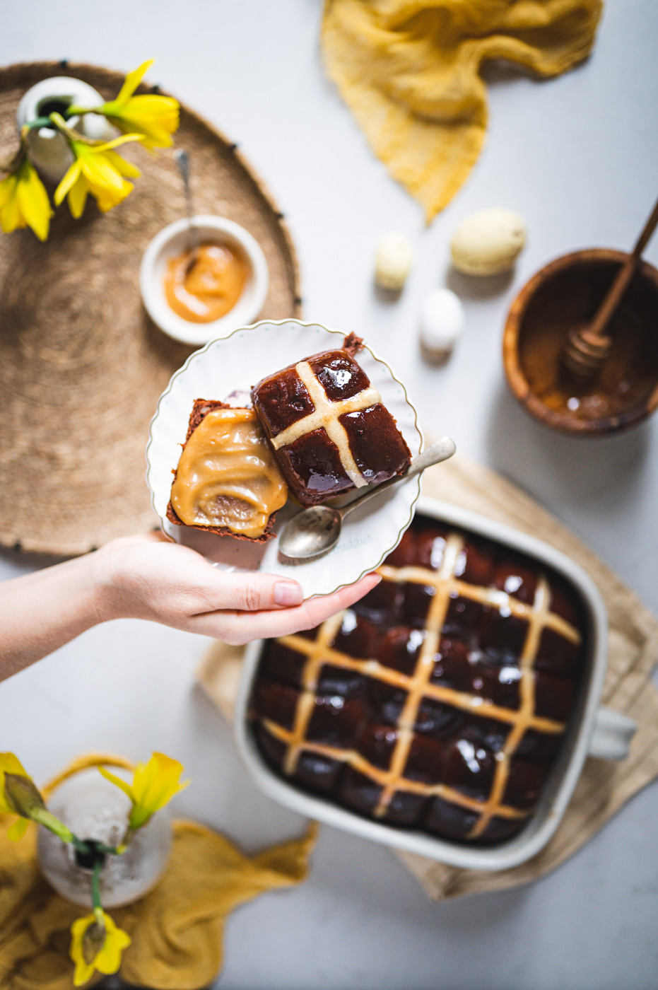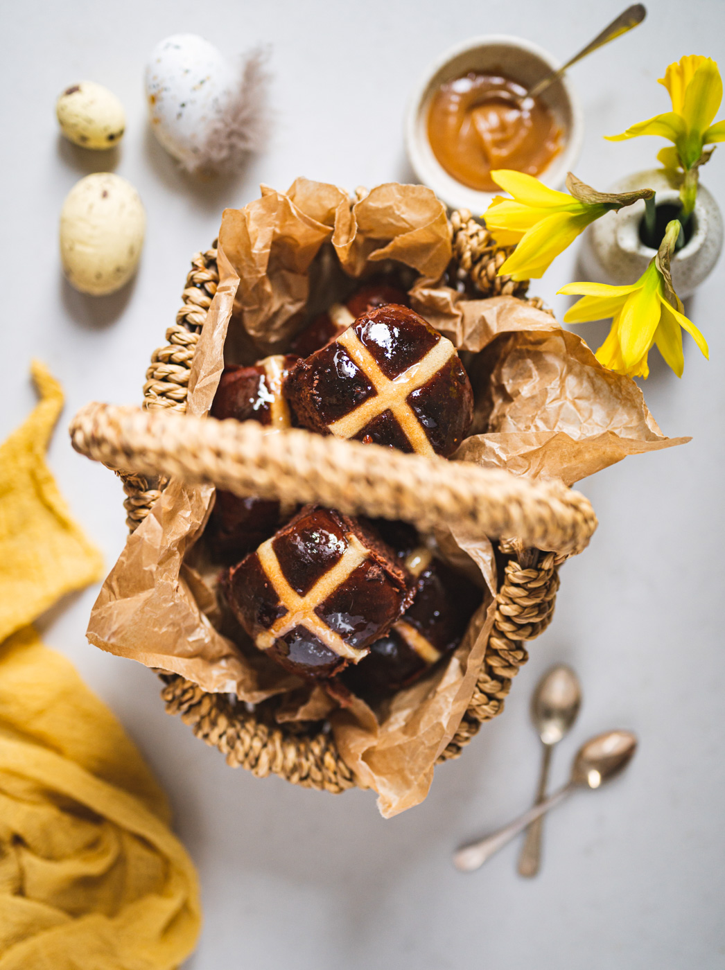 Hot cross buns jsou anglickou obdobou našeho mazance. Kříž na jejich povrchu má symbolizovat buď ukřižování, nebo měsíc rozdělený na čtvrtky. Tradičně se tyhle bochánky podávají na Velký pátek a nejlepší jsou za tepla, proto také mají v názvu „hot“. 🙂 Já jsem vymyslela čokoládovou variantu a jsem zvědavá, co na ni povíte! 🙂