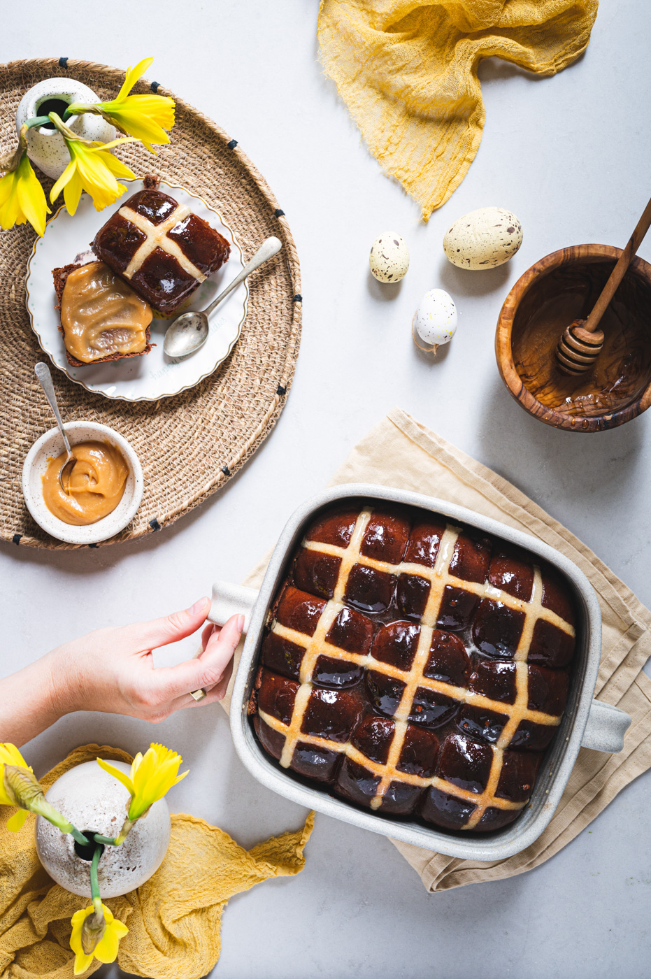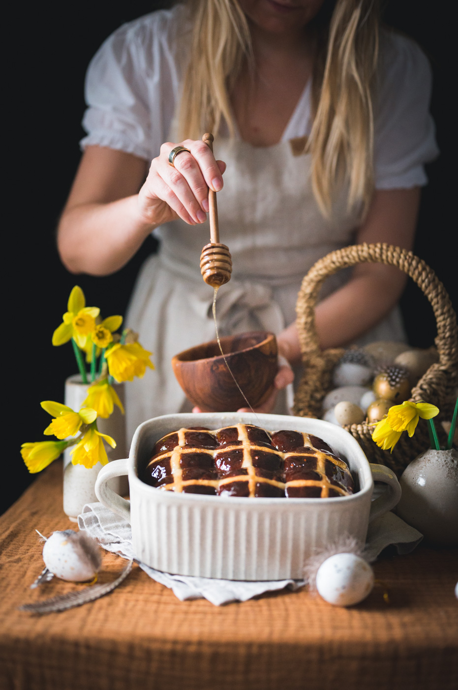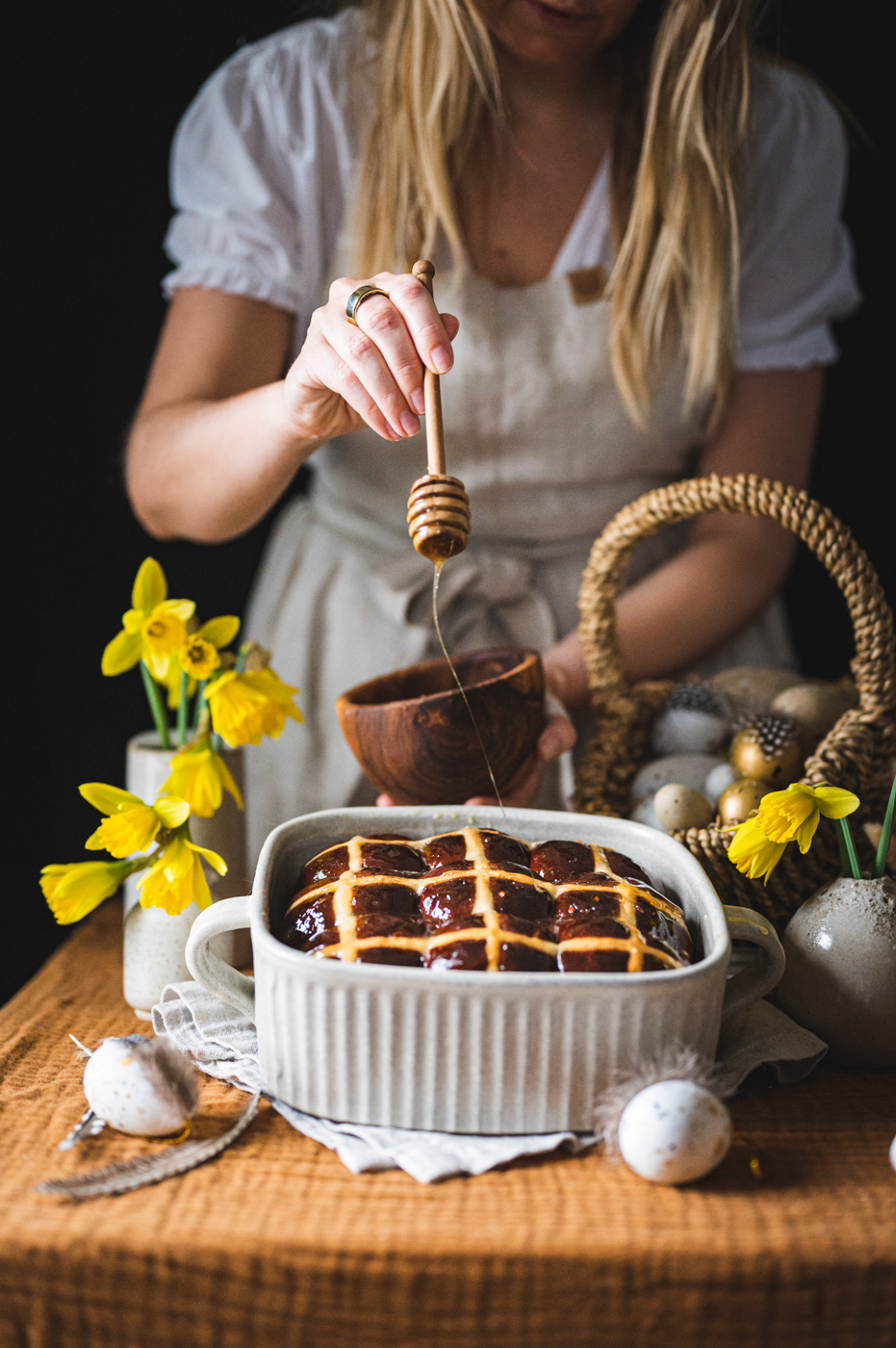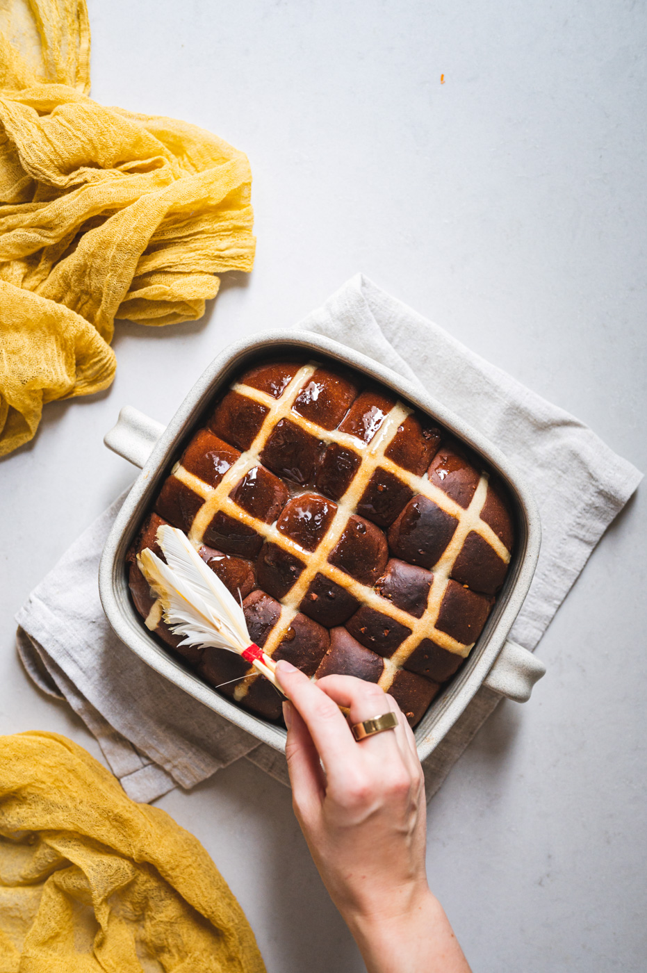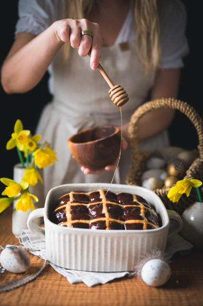Troubu předehřejte na 180 °C a pečte asi 30 minut, dokud houstičky nebudou krásně zlaté. Každopádně určitě nespoléhejte na časový údaj, každá trouba peče jinak. Zatímco se pečou, v malém rendlíku rozehřejte 5 lžic zlatého sirupu / medu. Jakmile hot cross buns vyndáte, potřete je pomocí mašlovačky sirupem. Pokud jej nemáte a nechcete použít ani med, potřete housky před pečením a zdobením rozkvedlaným vejcem.