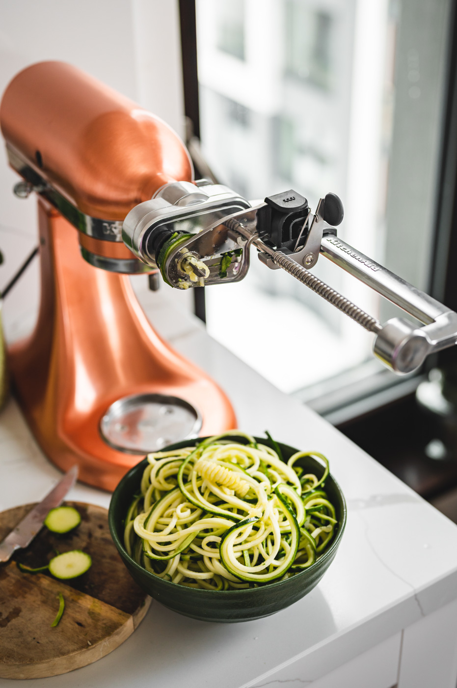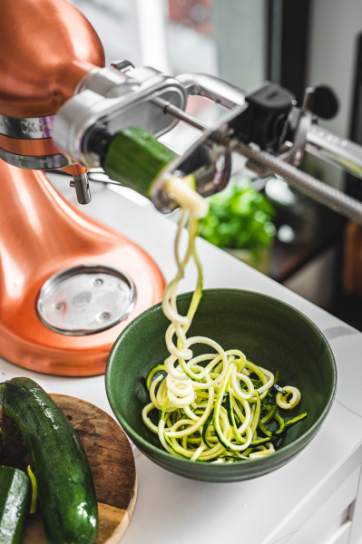 Nudle nakrouhejte na spiralizéru. Pokud ho nemáte, koukněte na internet – prodávají spoustu různých variant od 130 Kč. 🙂 Já mám nástavec na KitchenAid a je to skvělý pomocník. Dokonce si o něj teď můžete zasoutěžit na mém Instagramu! Pokud tedy máte nebo plánujete zakoupit stolní robot od KA, tak se také zapojte. 🙂 Sušená rajčata nakrájejte na proužky.