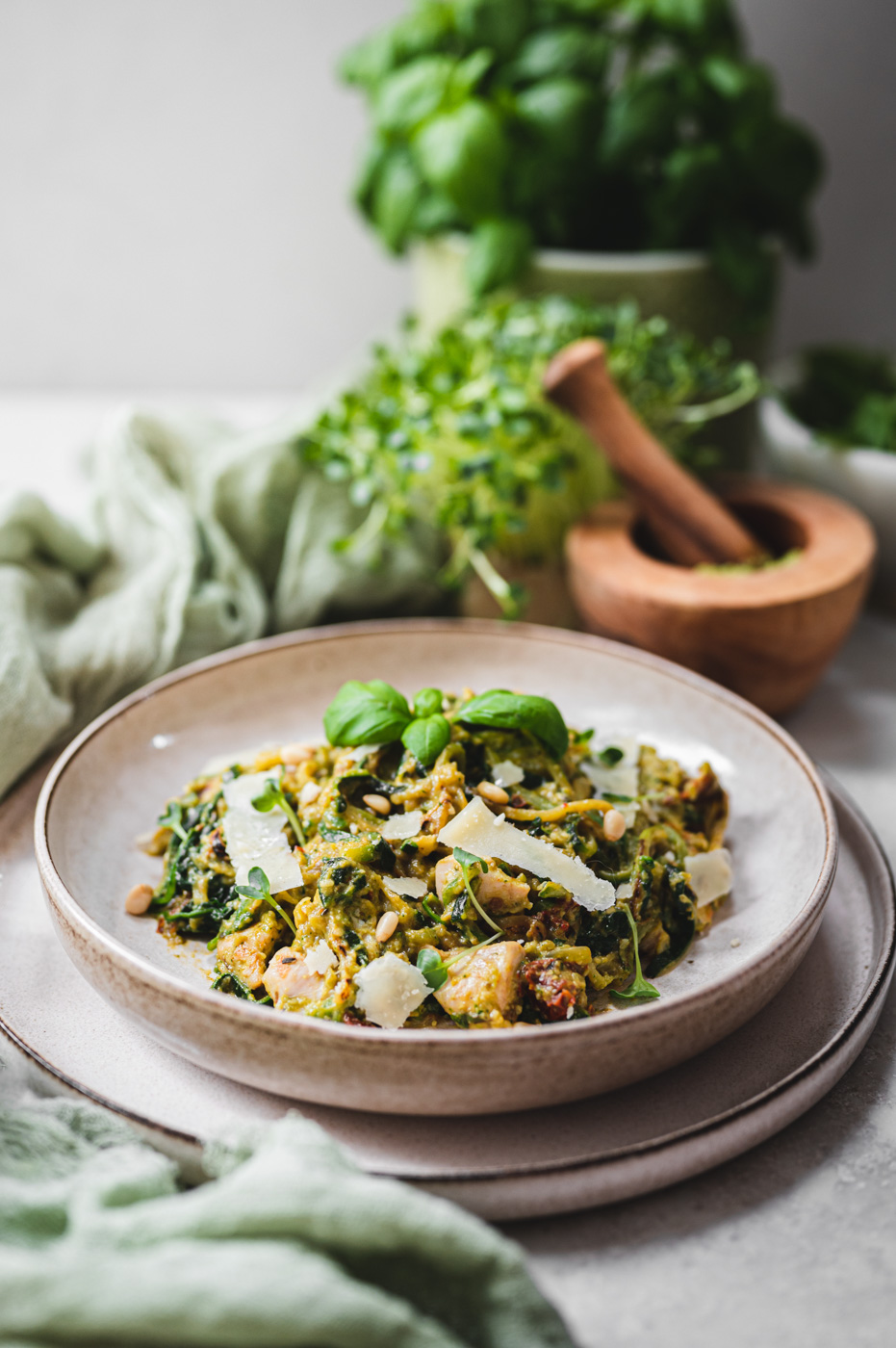 • piniové oříšky, bazalka a parmezán na ozdobení