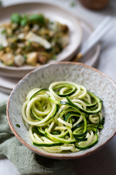 Cuketové špagety jsme si doma v poslední době šíleně oblíbili! Nemůžeme se dočkat cuket ze zahrádky od rodičů, to bude ještě lepší. 🙂 Kromě toho, že jsou opravdu výborné, jsou také super nízkosacharidovou variantou „špaget“ (a to říkám i já – zatvrzelý milovník kvalitních italských těstovin – fakt se to dá jíst :-D). Samozřejmě je ale důležité nudle udělat dobře – především z nich vyrestovat vodu a řádně je ochutit. Níže najdete náš nejoblíbenější recept.