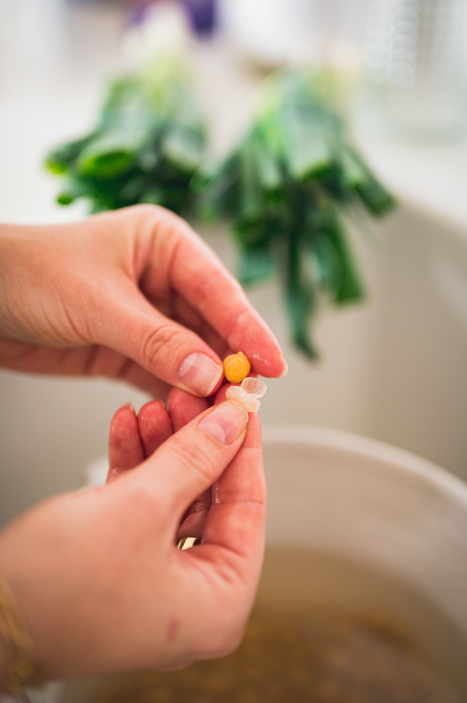 Cizrnu slijte a nasypte do misky. Zalijte vodou a nyní začněte cizrnu rukama mnout. Pro mě je to uspokojující činnost, která mě šíleně baví. Slupky se budou držet na hladině, tak je postupně vyndávejte stranou. Po chvíli loupání můžete klidně trochu vody slít, vyndat slupky a pak zase napustit další vodu a loupat dál. Nevadí, když vám nějaká ta kulička zůstane neoloupaná, ale slupky kromě hrubé konzistence i berou chuť, proto je opravdu super se jich zbavit. 🙂