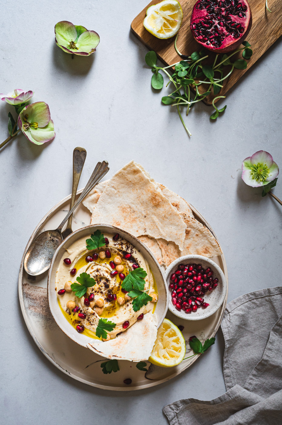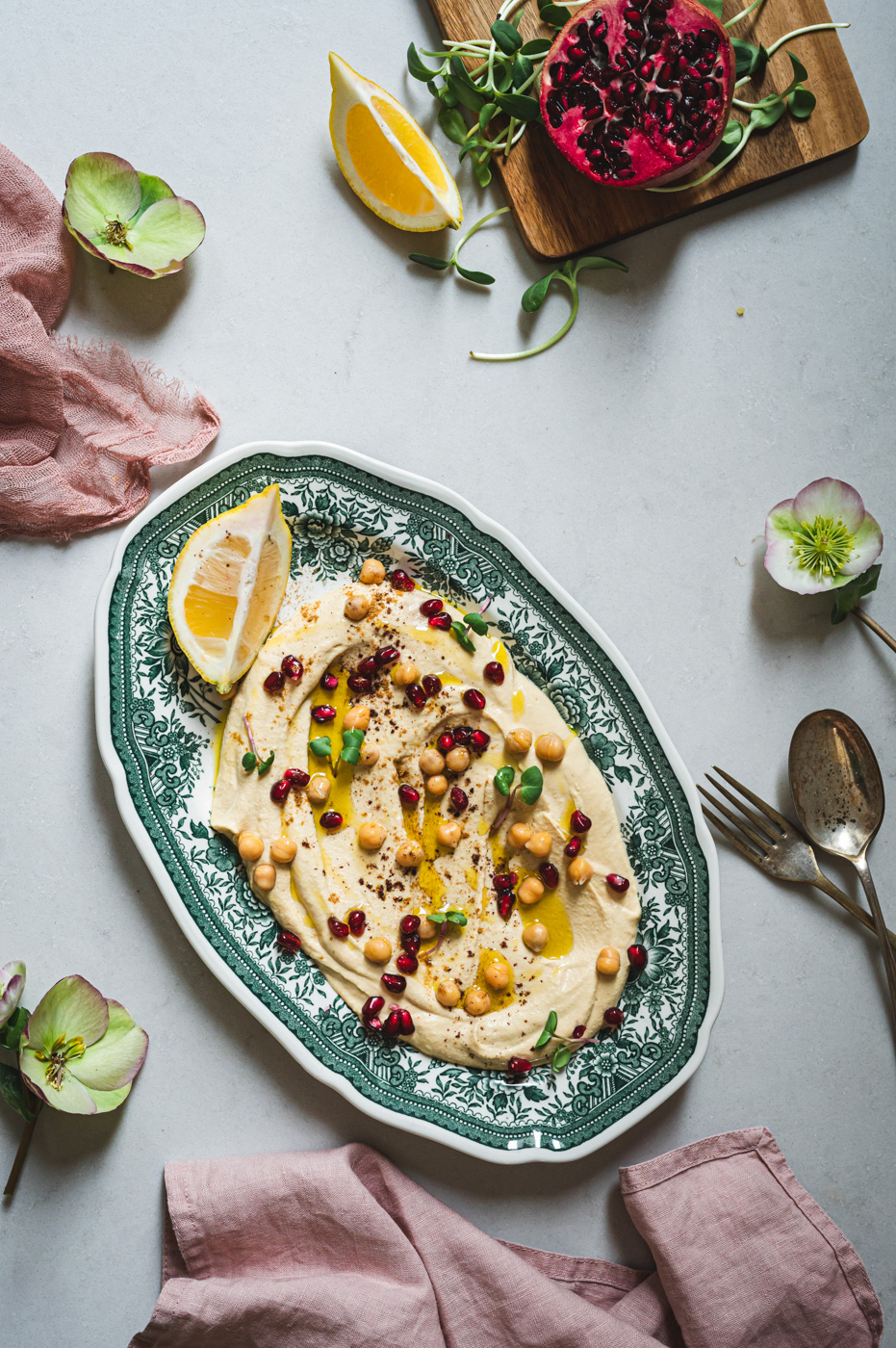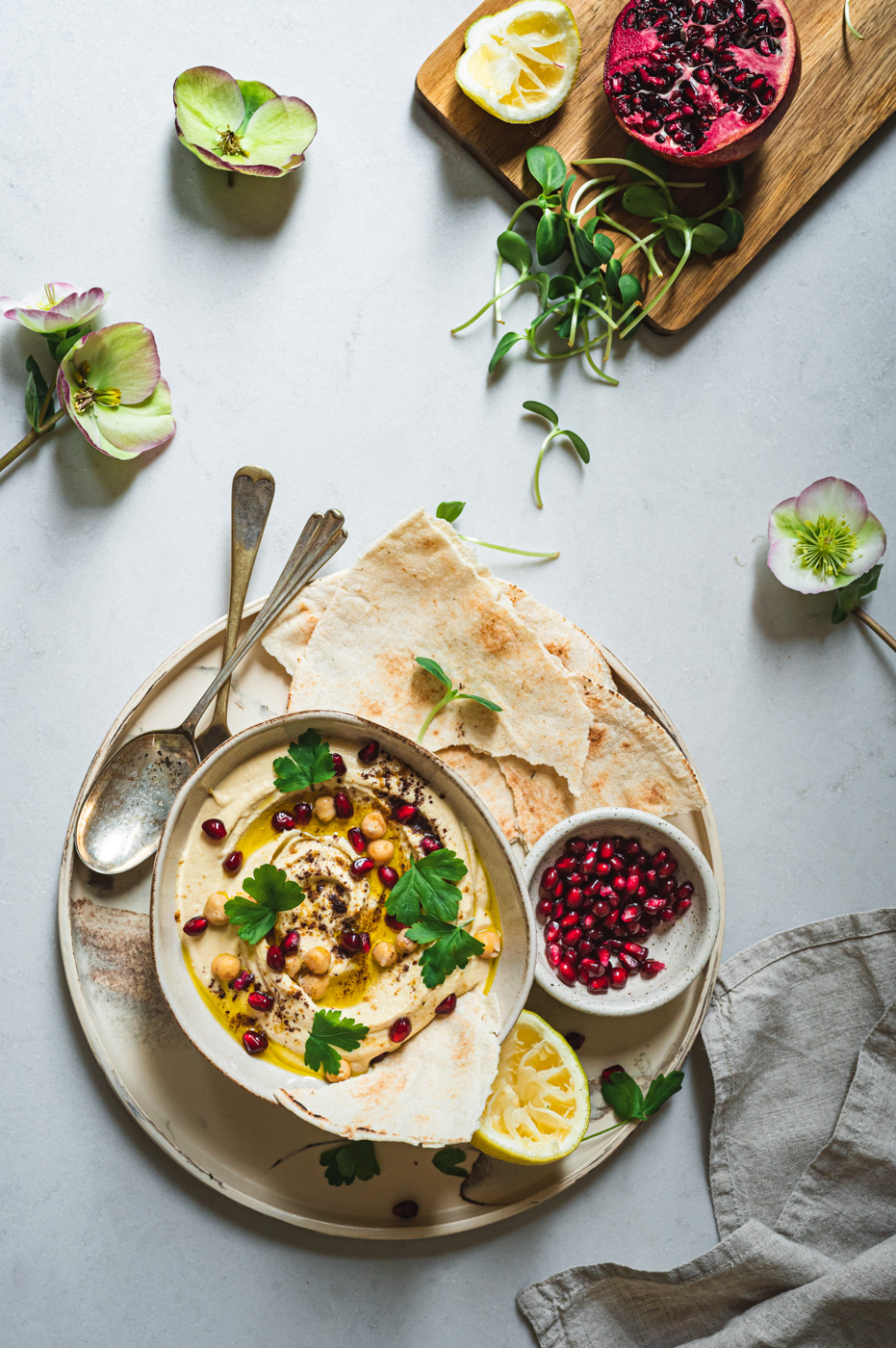 Na talíři hummus zasypte trochou sumacu, římského kmínu, granátovým jablíčkem, kuličkami cizrny, petrželkou a mikrobylinkami. Zakápněte olivovým olejem a servírujte s arabským chlebem a salátem tabbouleh. 🙂