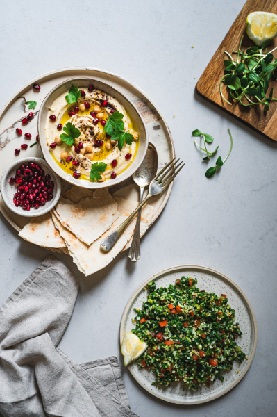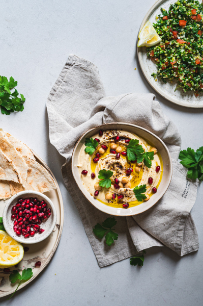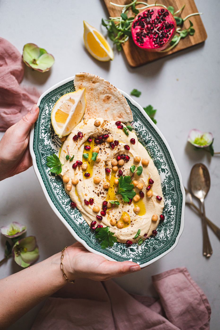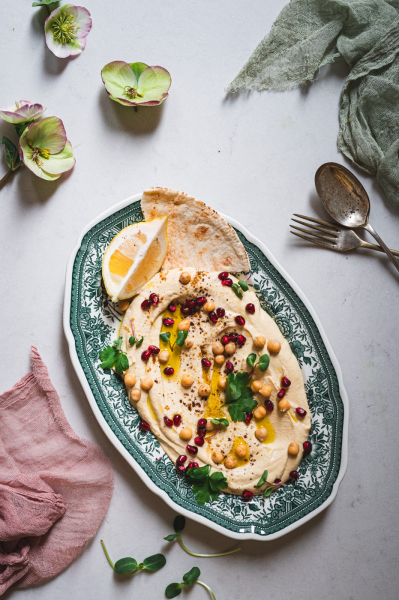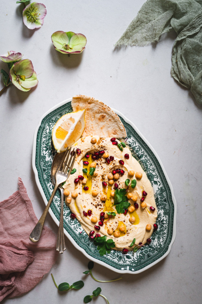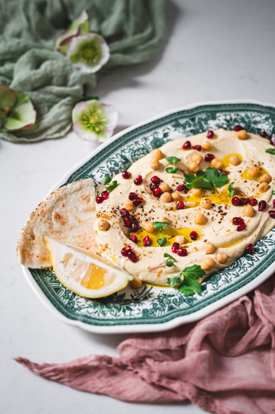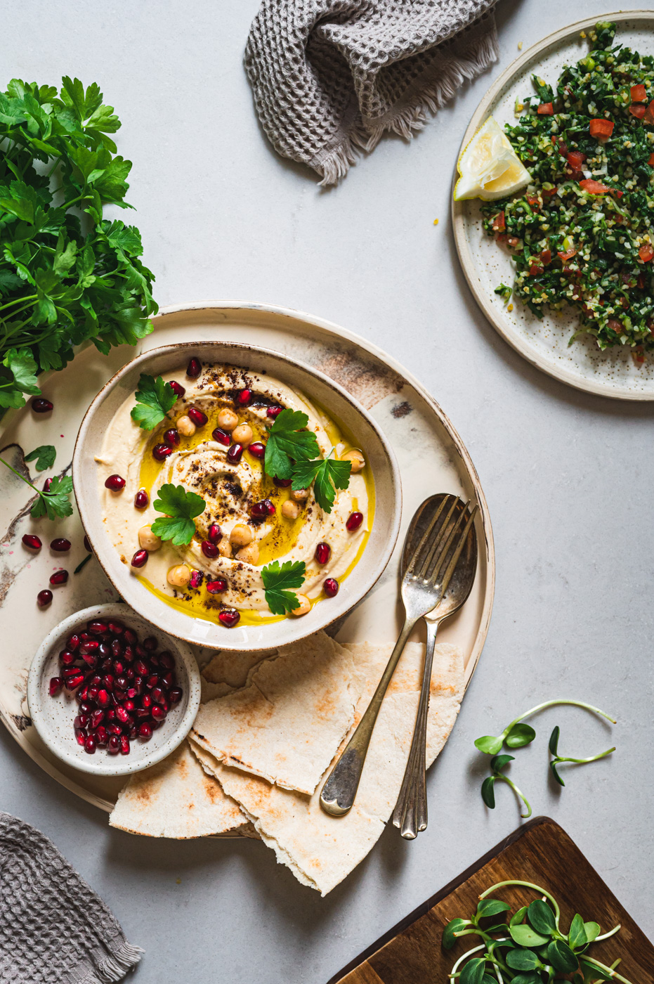 Na talíři hummus zasypte trochou sumacu, římského kmínu, granátovým jablíčkem, kuličkami cizrny, petrželkou a mikrobylinkami. Zakápněte olivovým olejem a servírujte s arabským chlebem a salátem tabbouleh. 🙂