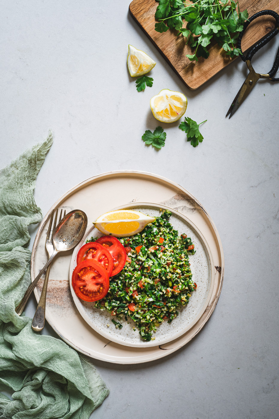 Salát tabbouleh patří mezi nejznámější blízkovýchodní saláty. Název údajně pochází z arabského slova tabil, což znamená okořenit. Bohužel ho často vídám jako salát z kuskusu, který tam určitě nepatří. A když už je tam správně bulgur, tak je ho tam moc a naopak málo petrželky. Jedná se totiž především o petrželový salát s trochou bulguru. 🙂