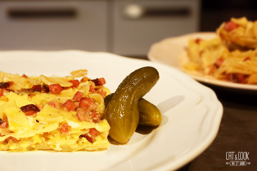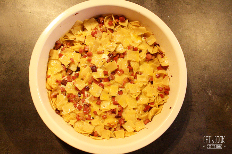 Mezitím si na kostičky nakrájej cibuli a krkovici. Ve větší pánvi osmahni cibuli pouze dokud nezesklovatí, přidej krkovici a restuj už jen asi 3 – 4 minutky. Přidej fleky (můžeš klidně rovnou z hrnce i s troškou vody – já to dělám děrovanou naběračkou), osol a opepři čerstvě mletým pepřem. Přendej do máslem vymazané formy a dej péct do trouby. Vejce si vyklepni do sklenice, rozkvedlej a trochu osol. Po 5 minutách vyndej fleky a nalij do nich vaječnou směs. Vrať do trouby a peč asi 15 minut, dokud nebudou vejce upečená. Fleky v troubě nenechávej zbytečně dlouho, vyndej je hned, jak budou hotové, zbytečně by se totiž vysušily.