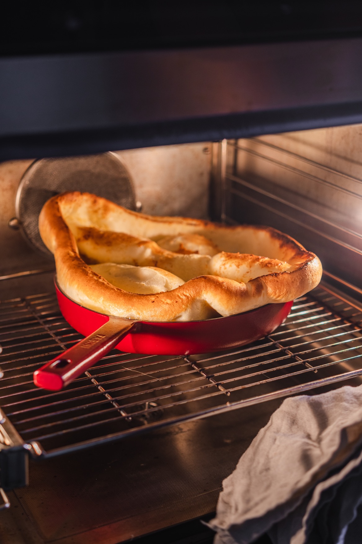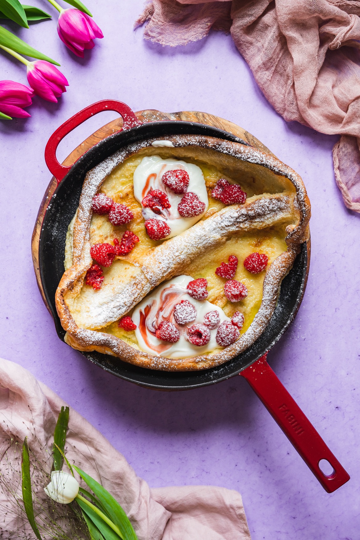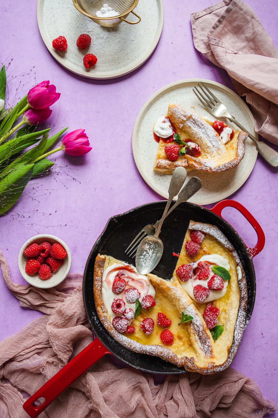 Na litinové nádobí nedám dopustit. Je skvělé nejen na pomalé dušení, ale v podobě pánve je využijete na steaky, všechna zapékaná jídla jako je třeba frittata, gratinované brambory, francouzské brambory, zapečené těstoviny, uděláte na nich perfektní volská oka, ham&eggs, můžete v nich díky dokonalé vodivosti a akumulaci tepla upéct chleba, pizzu a dokonce jsou dokonalé na sladké koláče díky kolmým okrajům. No a taky na tuto palačinku samozřejmě. 🙂 V pánvi upečete i celé kuře. Je to zkrátka kousek, který by ve vaší kuchyni neměl chybět, pokud rádi vaříte a pečete.