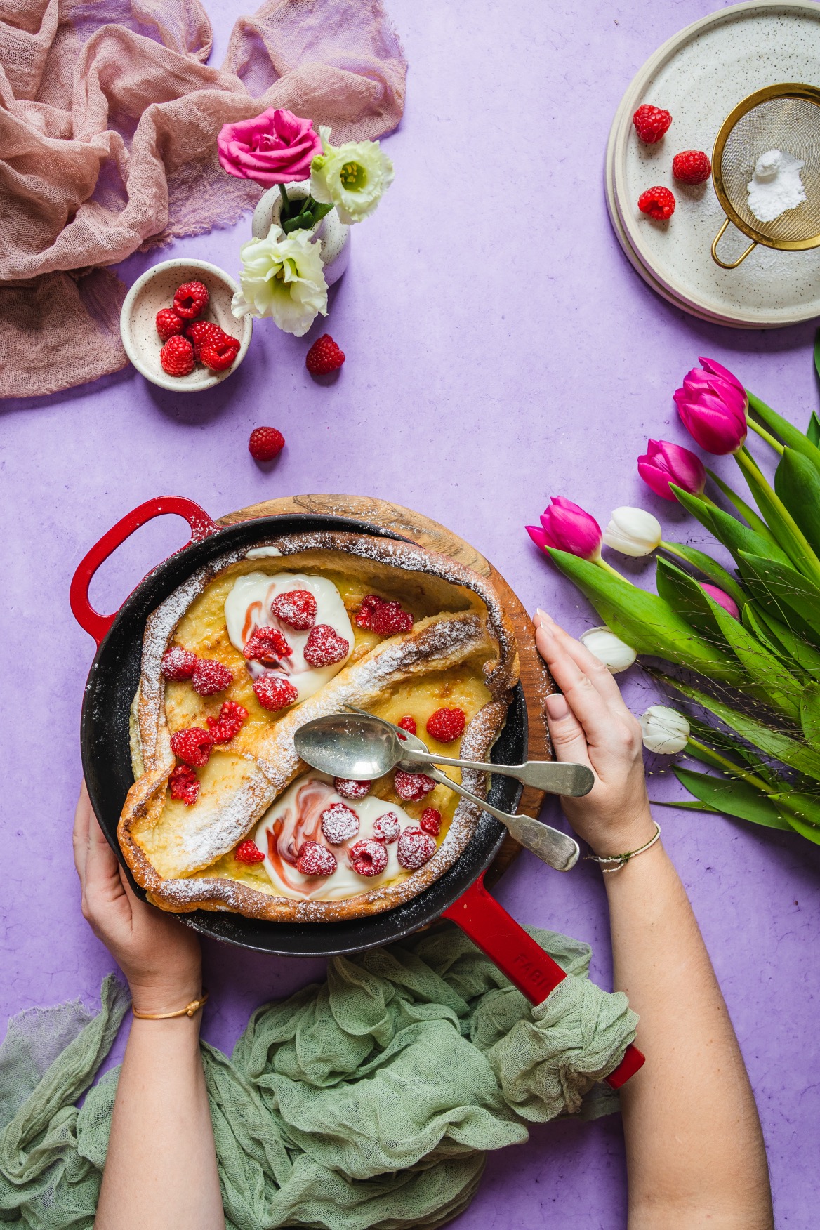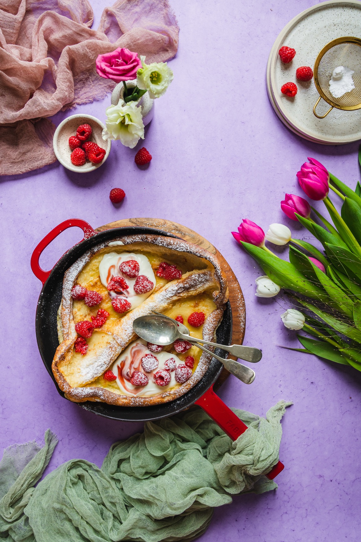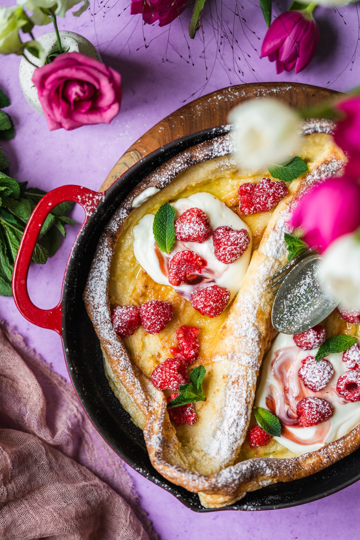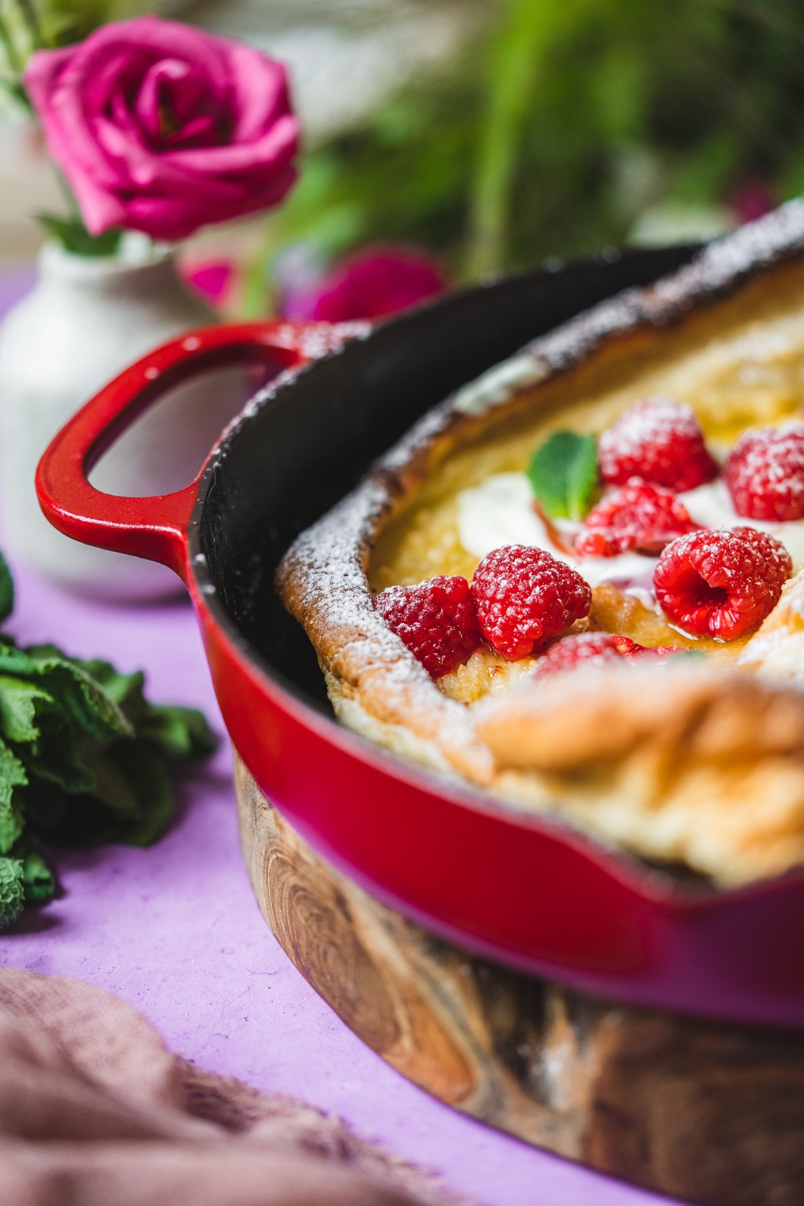 Na litinové nádobí nedám dopustit. Je skvělé nejen na pomalé dušení, ale v podobě pánve je využijete na steaky, všechna zapékaná jídla jako je třeba frittata, gratinované brambory, francouzské brambory, zapečené těstoviny, uděláte na nich perfektní volská oka, ham&eggs, můžete v nich díky dokonalé vodivosti a akumulaci tepla upéct chleba, pizzu a dokonce jsou dokonalé na sladké koláče díky kolmým okrajům. No a taky na tuto palačinku samozřejmě. 🙂 V pánvi upečete i celé kuře. Je to zkrátka kousek, který by ve vaší kuchyni neměl chybět, pokud rádi vaříte a pečete.