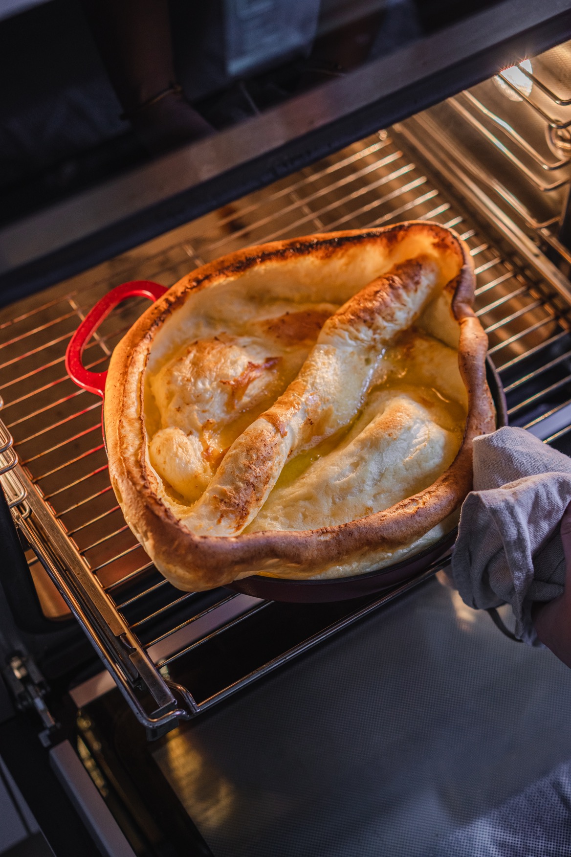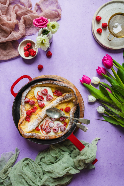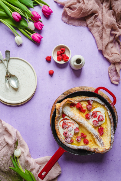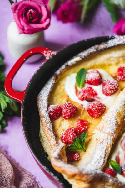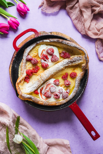 Asi nikdy mě nepřestane udivovat, jak krásně se tahle palačinka v troubě nafoukne. Sami uvidíte, že budete stát u trouby a pozorovat tu krásu. Ač jde o holandský název, dutch baby pochází z USA z roku 1900.