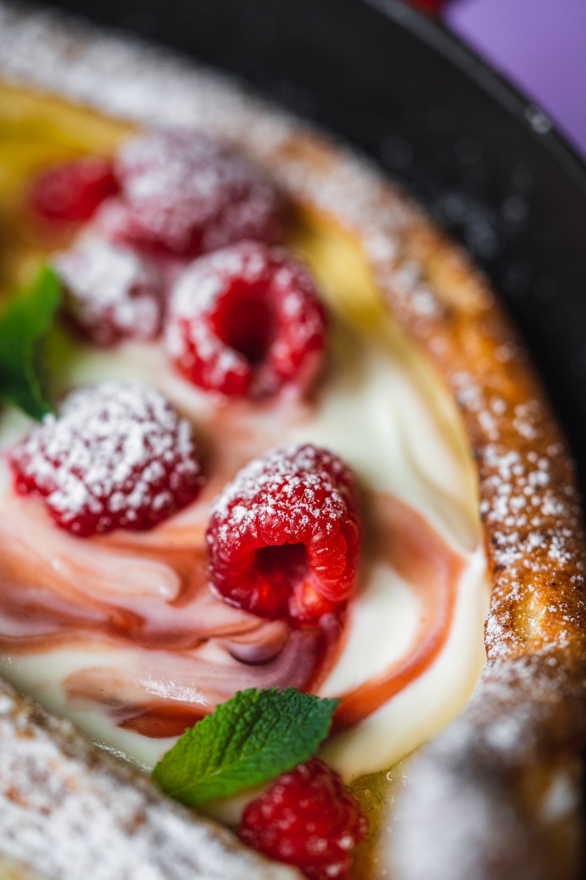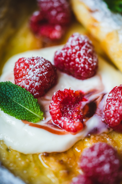 Po vytažení co nejrychleji servírujte posypanou moučkovým cukrem s jogurtem a malinami. 🙂