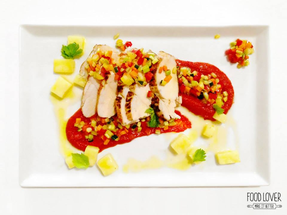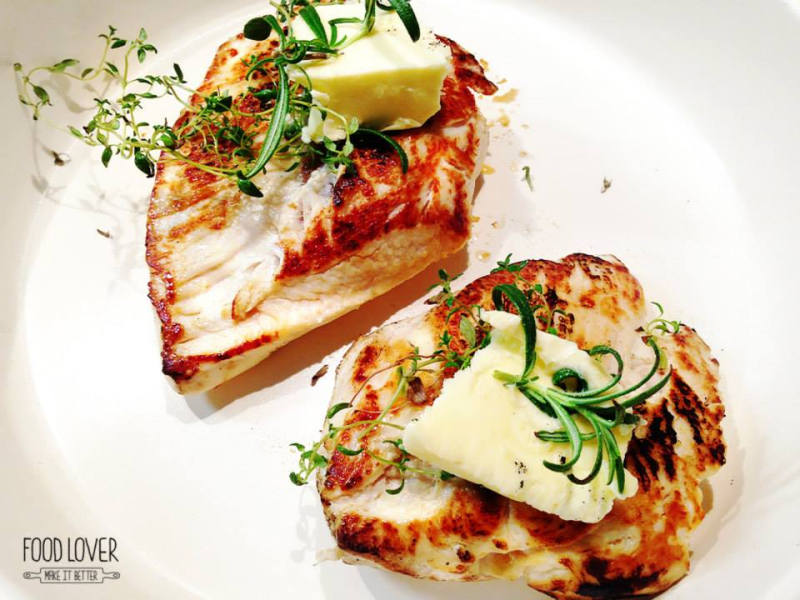 Očištěná prsa pokapej olivovým olejem, promni v rukou, vlož je na rozpálenou (suchou) pánev a opeč z obou stran (1 – 2 minuty z každé strany). Pak na ně přitiskni kousek másla a bylinky – nejlépe tymián a rozmarýn a dej je dopéct na 12 – 15 minut do trouby. Záleží na velikosti prsou, pokud máš malá, rozhodně je tam nenechávej 15 minut, byla by vysušená. Vnitřní teplota by měla mít 60 stupňů. Vyndej je a nech odpočinout 5 minut v misce s trouchou olivového oleje (misku přikryj). Před servírováním je osol a opepři čerstvě mletým pepřem.
