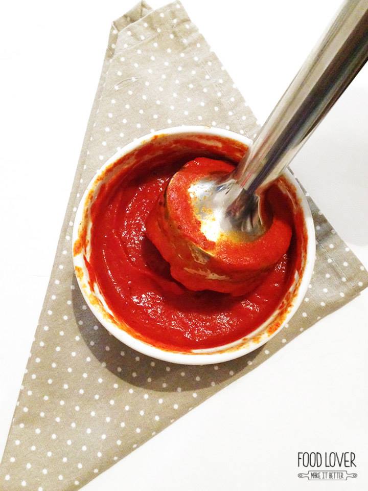 Papriky zbav jádřinců, pokapej je olivovým olejem a dej je na 200 stupňů péct do trouby (troubu si nech běžet). Nech je tam asi 15 minut nebo dokud na nich nebudou tmavé skvrny. Poté je vyndej a vlož do igelitového pytlíku asi na 5 minut. Zapaří se a půjdou lépe oloupat. Oloupané je tyčovým mixérem rozmixuj na jemné pyré, osol, opepři a uchovej na teplém místě.