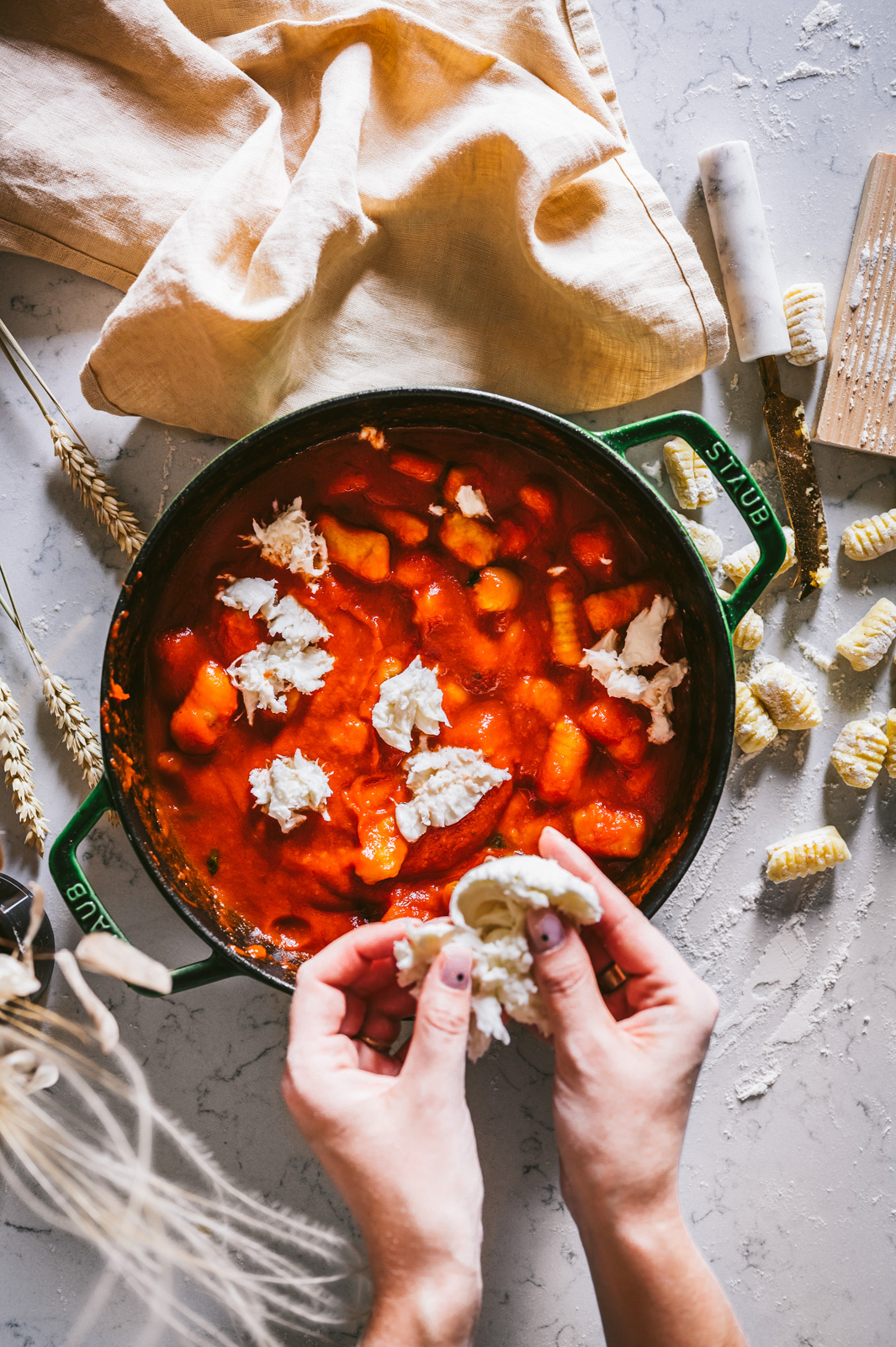 Hotové gnocchi rozprostřete na vál / plech a až budete mít všechny hotové, vložte je do osolené vroucí vody (nebo je můžete v tomto stádiu zamrazit a pak úplně stejně uvařit). Se solí do vody nešetřete, je to stejné jako u těstovin. Gnocchi jsou hotové, když vyplavou na povrch. Trvá to kolem jedné minuty. Děrovanou naběračkou je vyndejte a vhoďte rovnou do omáčky i s trochou škrobové vody, ve které se noky vařily. Promíchejte a stáhněte z plotny.