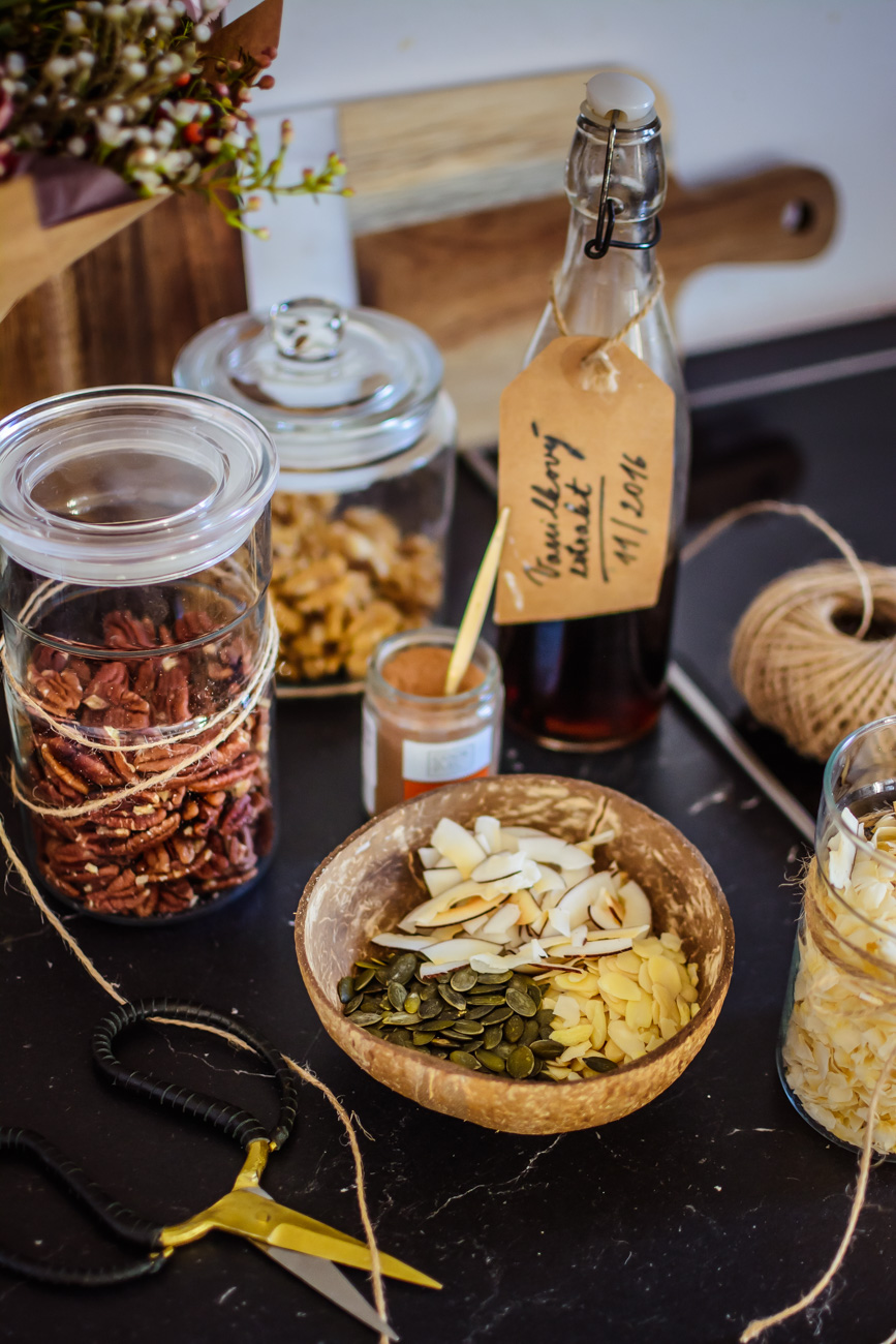 Vaše oblíbené vločky můžete také smíchat s otrubami, které granolu pěkně spojí. Já jsem použila ovesné vločky a otruby v poměru 2:1. Ořechy jsem vybrala své nejoblíbenější – pekany. Přidala jsem i trochu plátkových mandlí, řekněme asi 60 g z těch celkových 180 g. Obecně platí – čím víc oříšků, tím víc chuti 🙂 Takže pokud jich dáte víc, určitě to nevadí. Skvělé jsou také kešu ořechy, lískáče nebo třeba pistácie. Naopak – co se semínek týká, nepřehánějte to, je lepší, když jich ve směsi není tolik. Můžete dát lněné, slunečnicové či dýňové, záleží na vás.