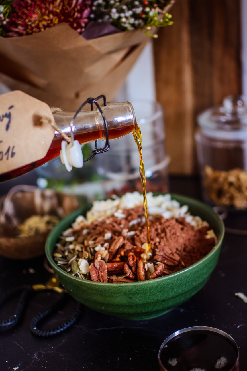 Asi 20 g kokosu odsypte stranou do mističky a nechte na pozdější použití. V míse smíchejte vločky, ořechy, semínka, kokos, kakao, sůl, skořici a promíchejte. Zalijte javorovým sirupem a (tekutým) kokosovým olejem. Promíchejte a ochutnejte – směs případně dochuťte podle své touhy 🙂