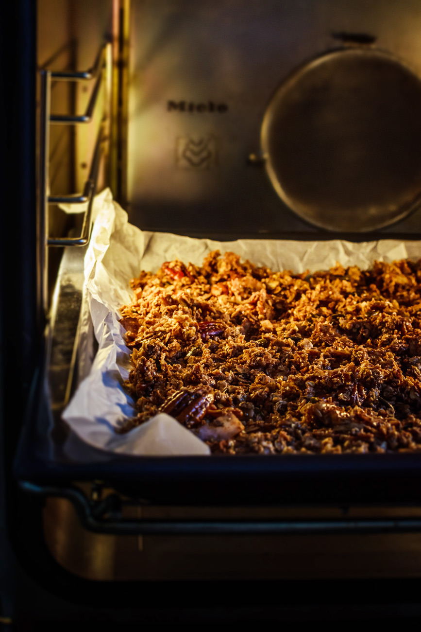 Troubu rozehřejte na 150 stupňů a granolu pečte ve středu trouby asi 30 – 40 minut. V polovině pečení ji promíchejte. Pokud chcete, aby byla granola spíš slepenější, tak ji nemíchejte, jen ji hlídejte, aby se nespálila, je to pak celkem rychlovka! Granola je hotová, když vám to doma krásně voní a vše je opečeno „tak akorát“. Těžko se to popisuje, granola začne jakoby trošku šustit, ale stále je trošičku vlhká. Ona když pak vystydne, tak je mnohem křupavější, než se zdá být v horkém stavu.