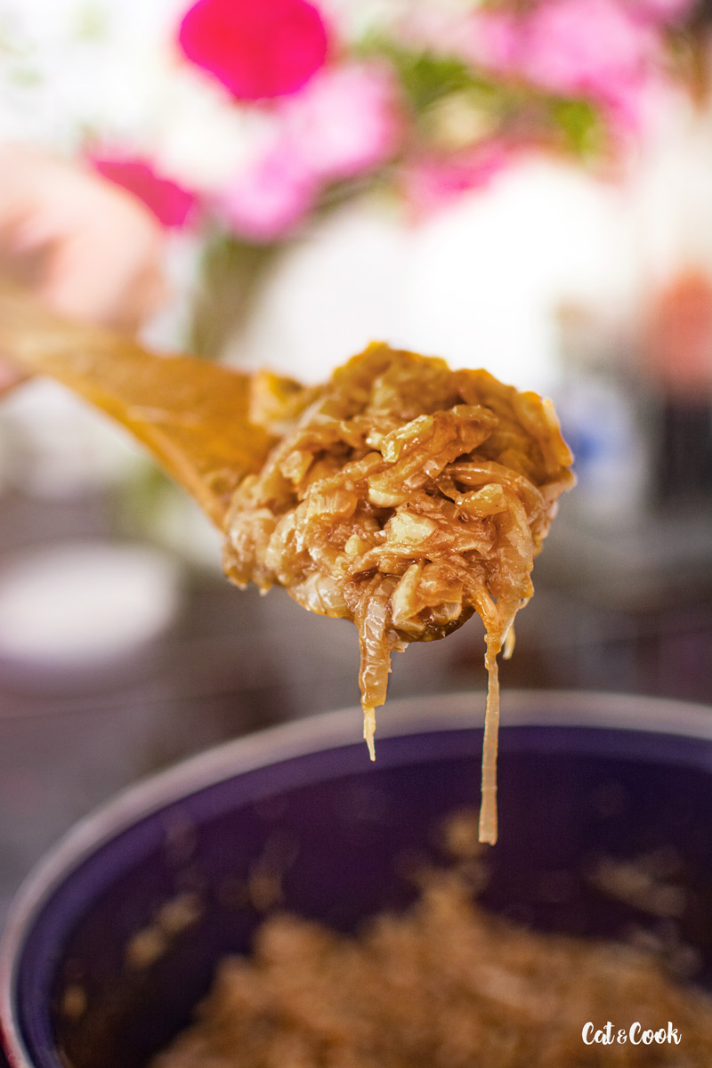 Oloupanou cibuli překroj na půlku a nakrájej na stejně velké proužky. Na středním ohni si v hrnci se silným dnem rozehřej máslo, přidej všechnu cibuli a pomalu restuj asi 10 minut. Poté přikryj pokličkou a dus dalších 10 minut (občas promíchej, cibule se začne přichytávat). Sundej poklici a za častého míchaní nech cibuli zkaramelizovat do tmavohnědé barvy. Bude to trvat asi 25 minut.