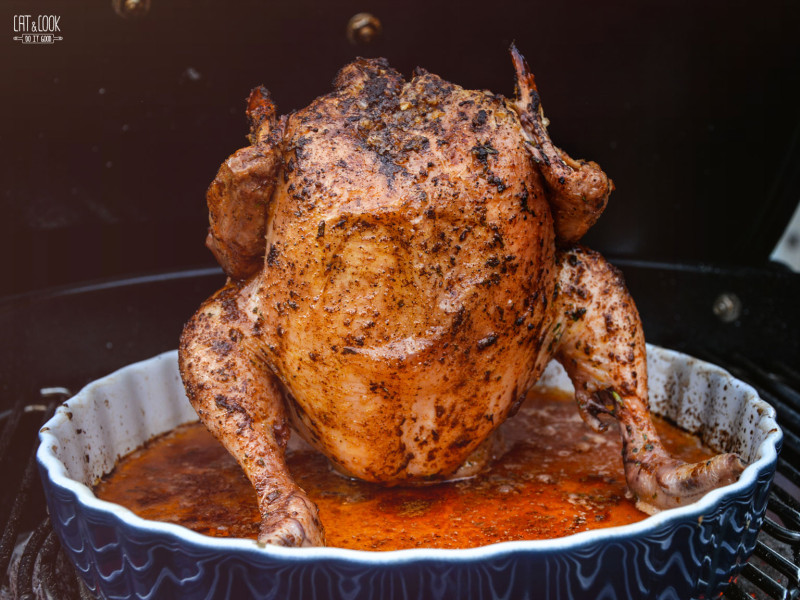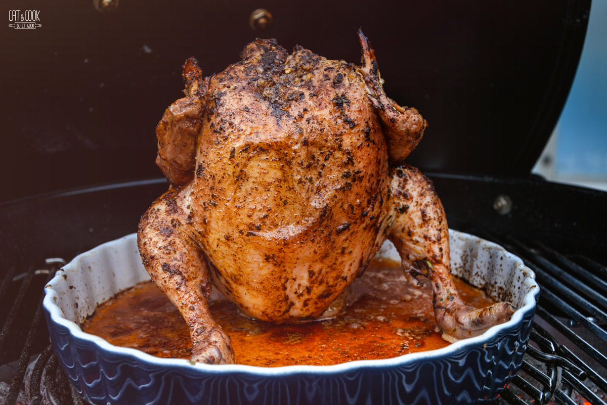 Poté ho polož na rozpálený gril na 160 – 180 stupňů a griluj cca 1 hodinu. Já vždycky používám digitální vpichový teploměr na kontrolu teploty. Když má kuře vnitřní teplotu 65 – 68 stupňů, začni ho pomazávat ochuceným máslem. Stačí 1 – 2 x, dokud se kůžička pořádně neopeče. Cca po 7 – 10 minutách (nenechávej v grilu kuře dlouho, protože jinak by paprikové máslo zhořklo) kuře vyndej a nech 5 – 10 minut odpočinout. Dojde tak do ideální teploty 75 stupňů. Pozor, nižší teploty se u kuřete nedoporučují!