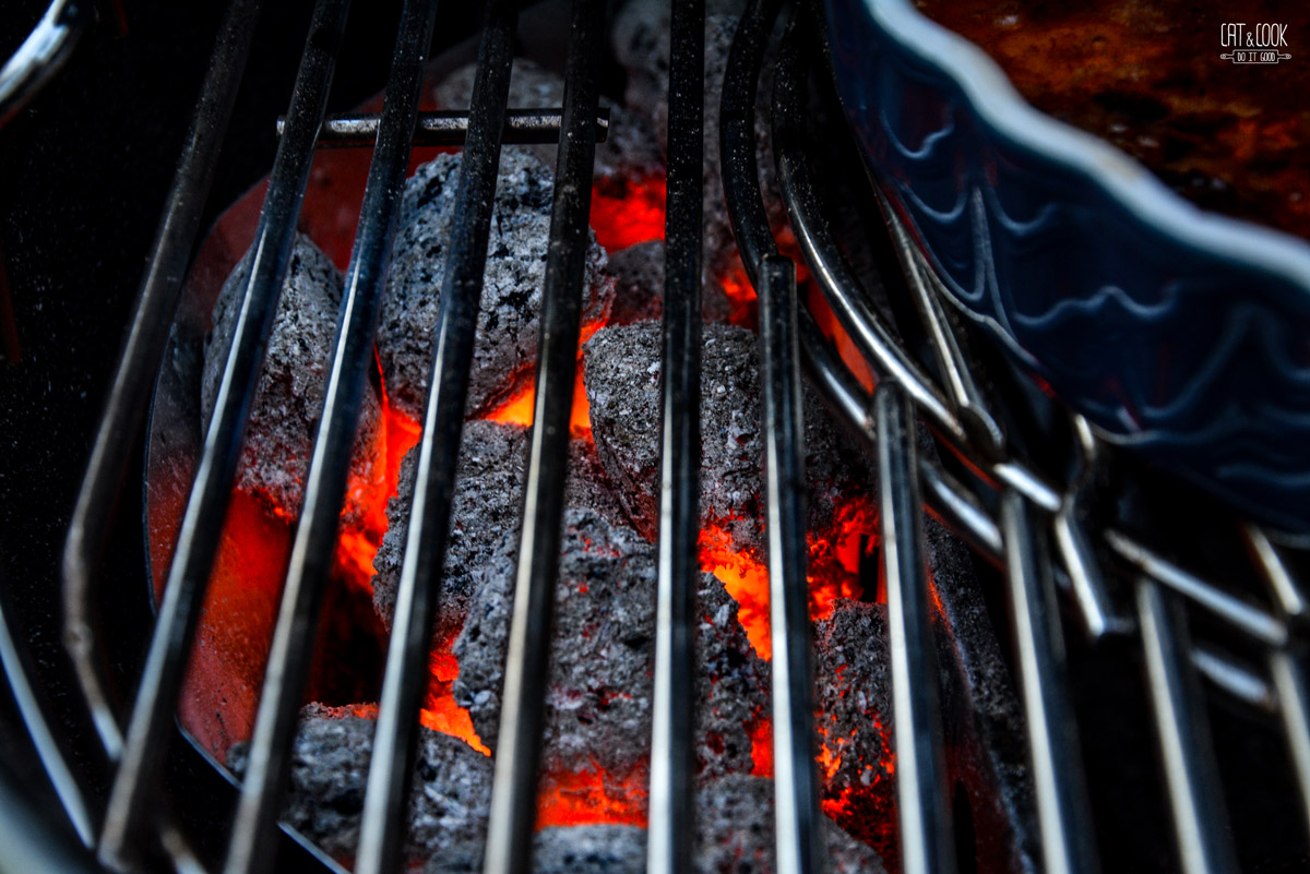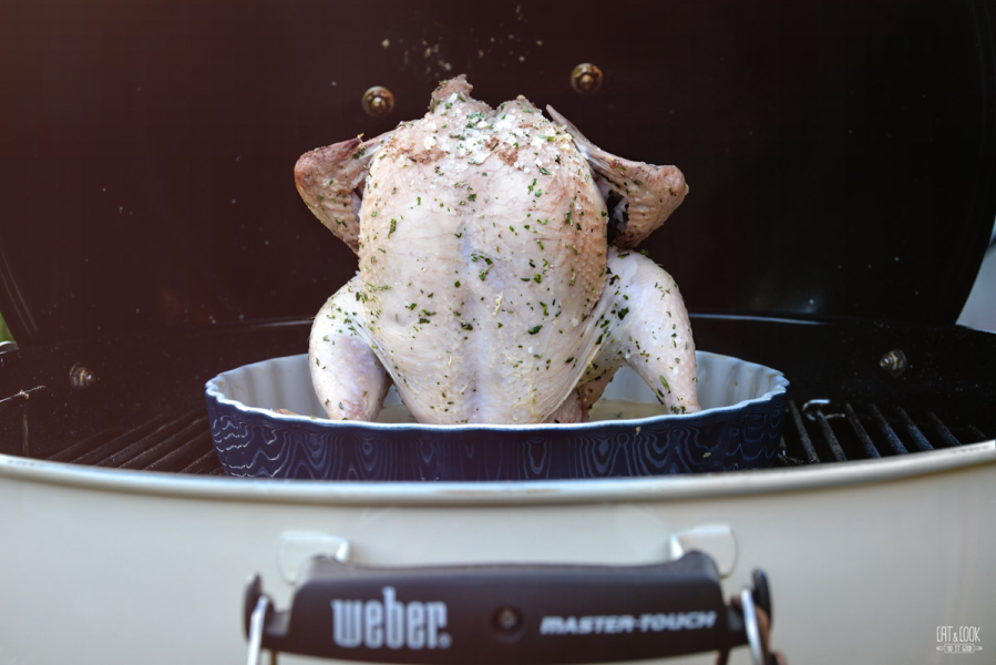 Pokud máte kotlový Weber gril jako já, rozpalte si brikety a nasypte je do přihrádek (palivové nádoby). Ty položte na gril tak, abyste dosáhli „nepřímého grilování“, tedy po stranách. Pokud máte plynový, či elektrický gril, rozpalte polovinu či okrajové části. Kuřátko se tak krásně propeče uvnitř a nespálí zvenku.