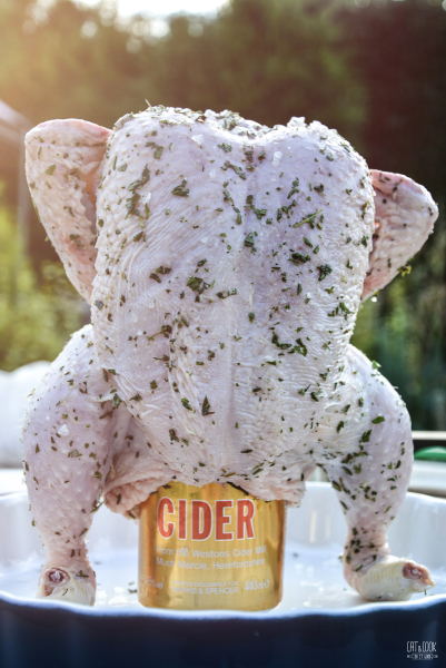 Kuře vyndej z lednice a nech ho 40 minut dojít do pokojové teploty. Plechovku se ciderem otevři a asi polovinu odlij. Posaď na ni kuře tak, aby samo drželo postavené. Křídla dej kuřeti za hřbet. Přesuň na zapékací mísu a podlij částí cideru. Ten zbytek můžeš vypít 🙂
