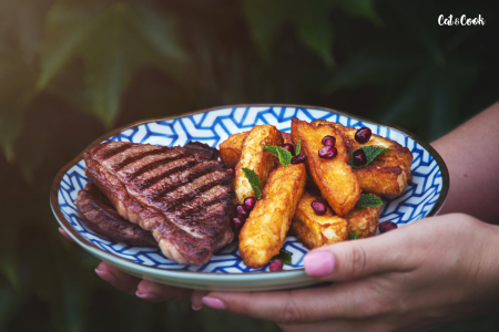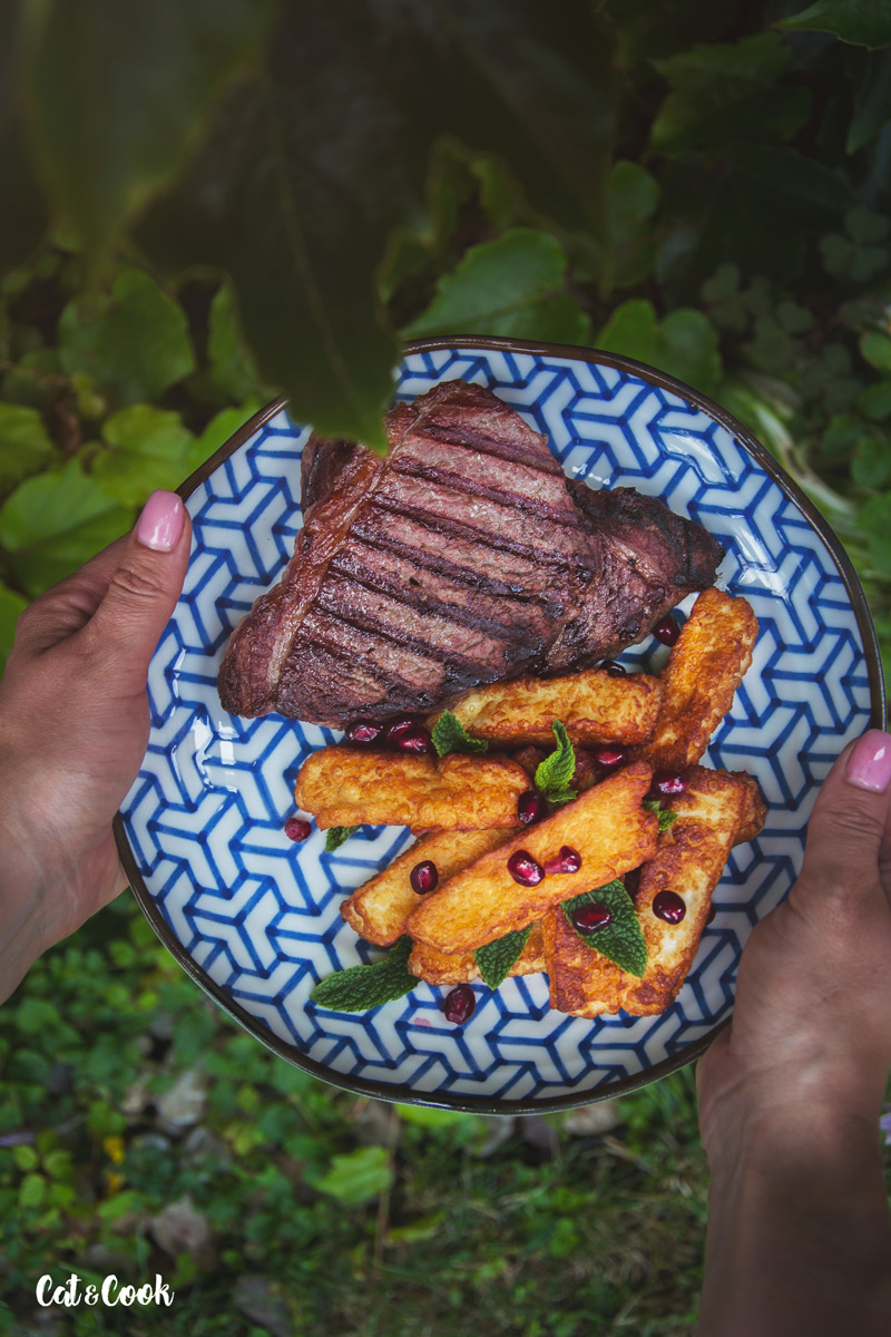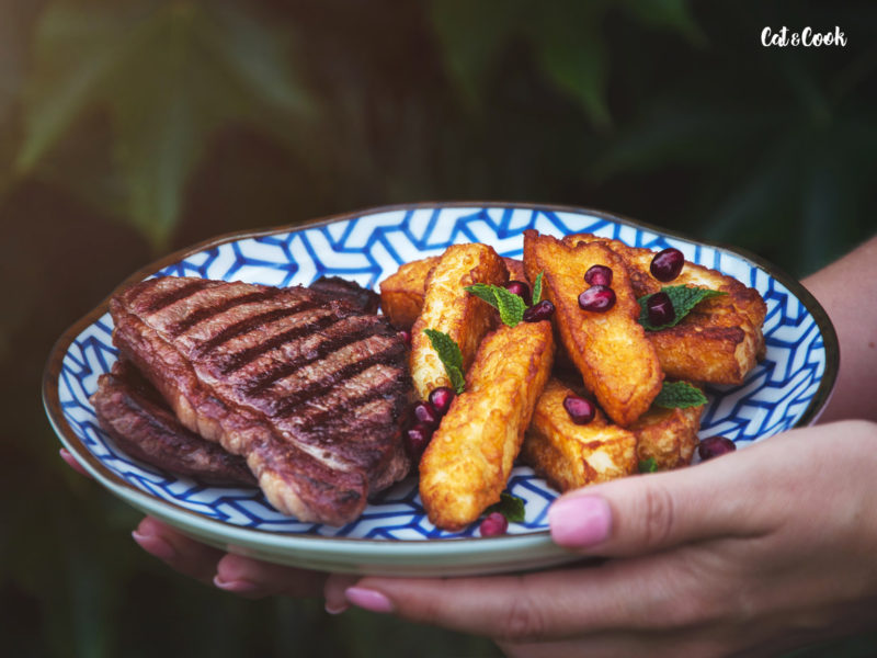 Hranolky nandejte na talíř a ozdobte granátovým jablkem a mátou. Podávejte s vaším oblíbeným steakem a ochuceným jogurtem. Jíst je ale můžete samotné bez masa nebo s bramborami místo „českého smažáku“.