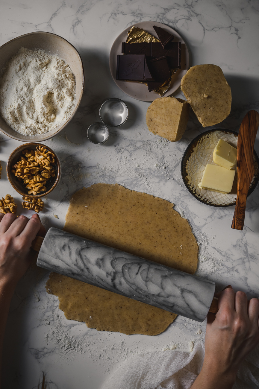 Nyní je na řade takzvaná fraisage. Jedná se o závěrečné hnětení těsta, kdy dochází k úplnému spojení tuku s moukou. Tato metoda nám zajistí křehkost výsledného cukroví. 🙂 Těsto položte na lehce pomoučněný vál. Hranou dlaně (ne celou dlaní, která je moc teplá) sklouzněte po části těsta asi 15 cm směrem od sebe. Těsto se hezky rozmázne po válu, a to je přesně to, co chceme. Až bude celé těsto uhnětené, špachtlí / rukou z něj znovu vytvarujte nepravidelnou kouli a opakujte ještě jednou. Poté těsto vytvarujte do koule a zabalte do dvou vrstev potravinové fólie. Takto uhnětené těsto by mělo odpočívat v lednici minimálně 2 hodiny, ale lepší je nechat ho přes noc.