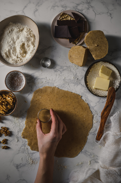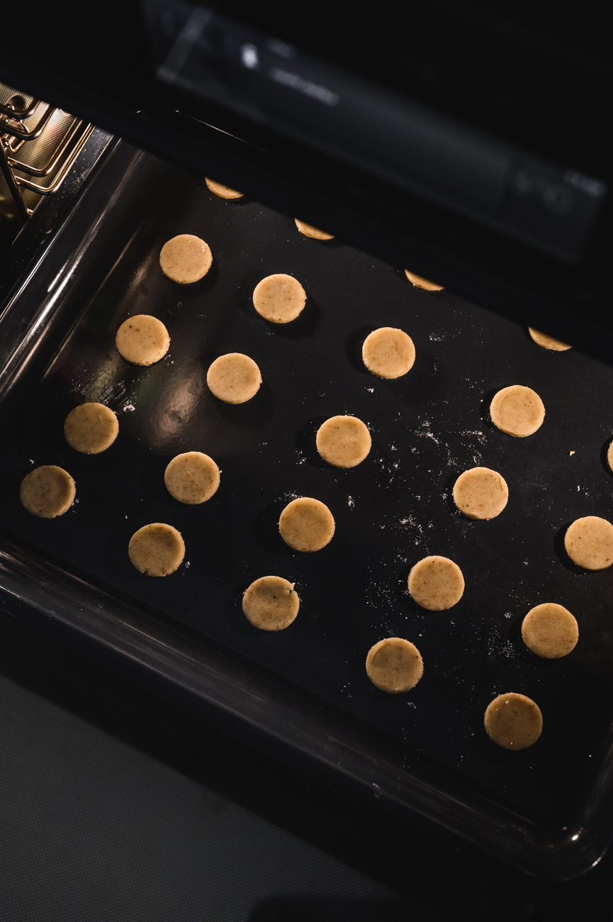 Troubu předehřejte na 180 stupňů (případně 165 stupňů horký vzduch). Odpočinuté těsto vyndejte z lednice a vyválejte plát silný cca 5 – 6 mm. Důležité je nedělat kolečka moc tenká, těsto je hodně máslové a špatně by se s ním pracovalo. Vykrájejte spíše menší kolečka (těsto se totiž trochu rozlije) a pečte na plechu vyloženém pečícím papírem dorůžova. Trvá to asi 8 – 10 minut. Nezapomeňte si nechávat větší mezery mezi kolečky. Nechte vychladnout a mezitím si připravte krém.