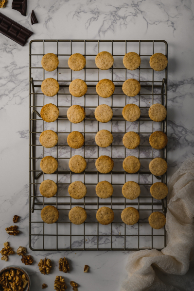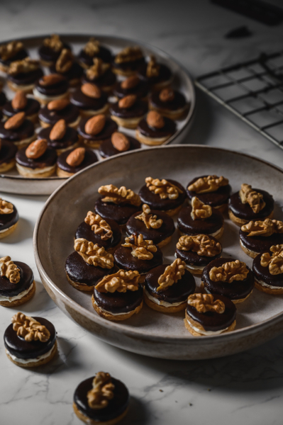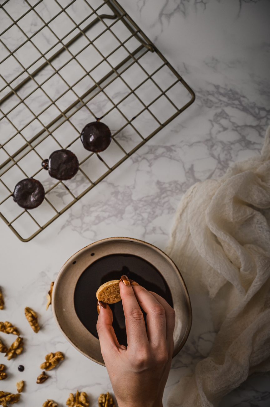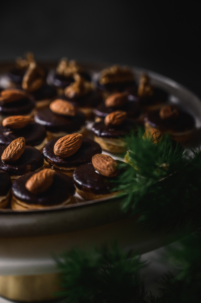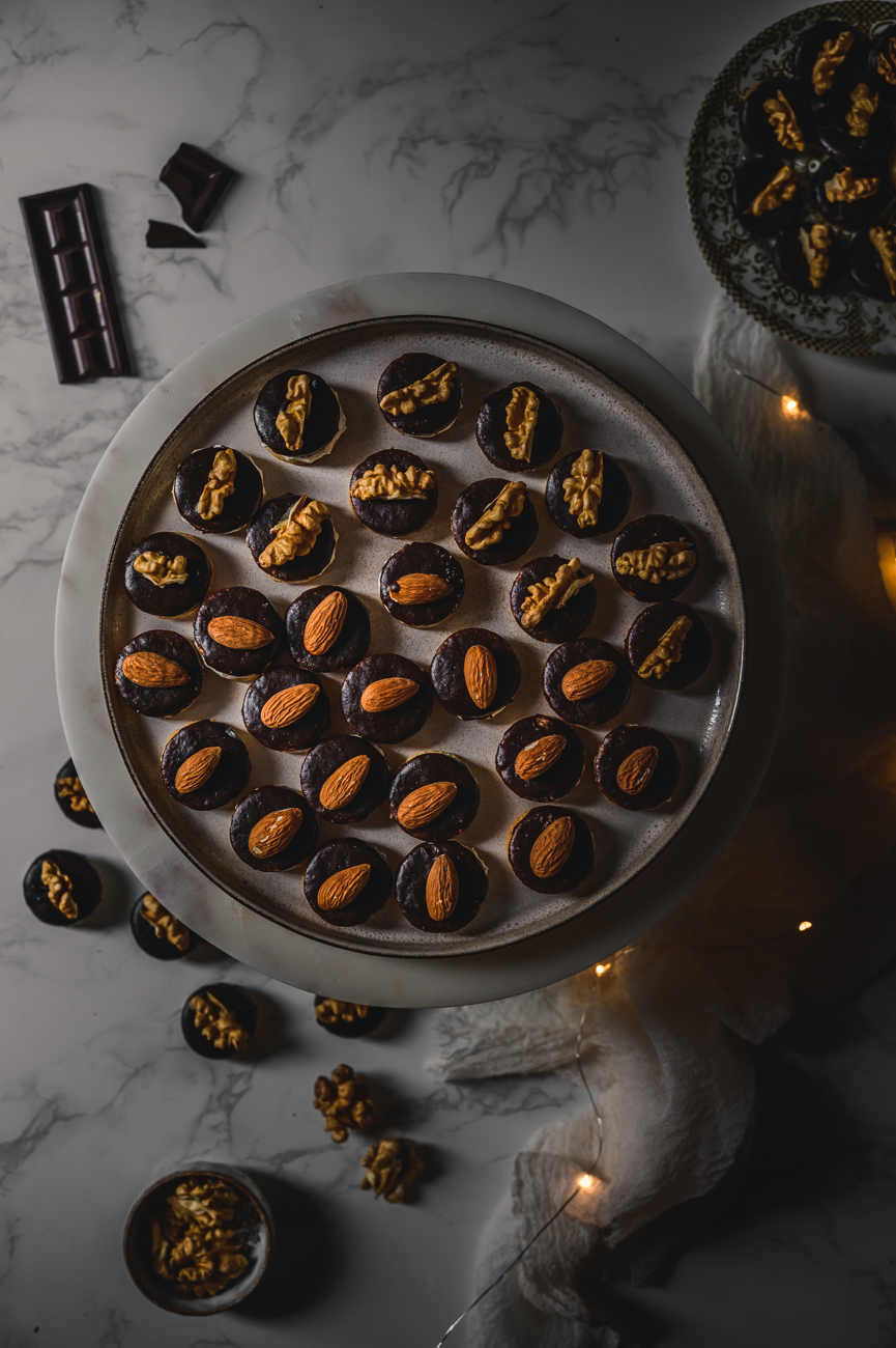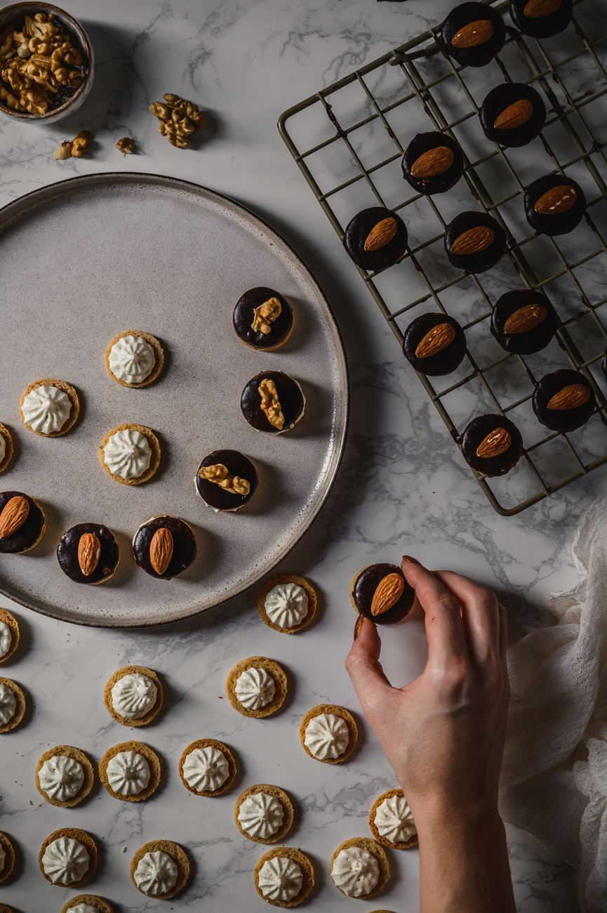 Polovinu koleček máčejte v čokoládě, nechte okapat a odkládejte na pečicí papír. Na každé polité kolečko položte mandli nebo kousek vlašského oříšku a nechte čokoládu ztuhnout. Poté je pokládejte na pomazaná kolečka. Skladujte v uzavřené nádobě v chladu. 🙂