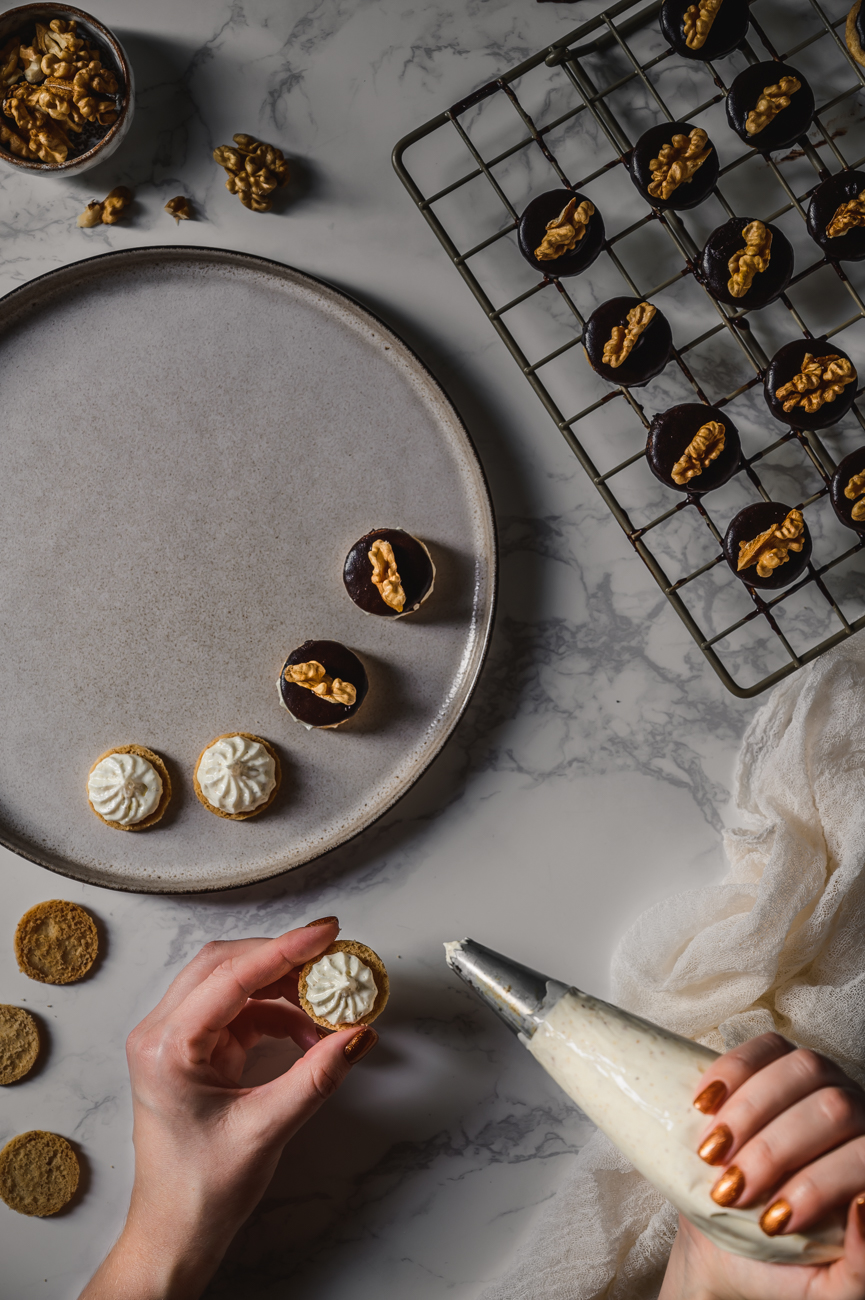 Máslo pokojové teploty mixujte 10 – 15 minut samotné, dokud nenabyde na objemu. Bude krásně nadýchané a světlé. Do másla přidejte cukr podle chuti a ořechy. Pokud máte rádi kakaovou chuť, můžete dovnitř připravit tmavý krém. Přidejte tedy 4 lžíce kvalitního kakaa a promíchejte, dokud nebude krém hezky zabarvený. Já ale připravuji krém světlý, do kterého přidávám vanilku. Krém naneste do zdobícího pytlíku s libovolnou zdobící špičkou a nastříkejte ho na polovinu koleček. Pokud nemáte sáček, kolečka můžete pomazat pomocí nože.