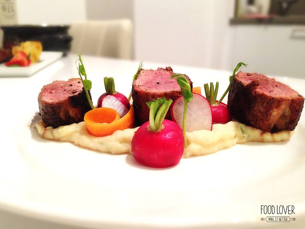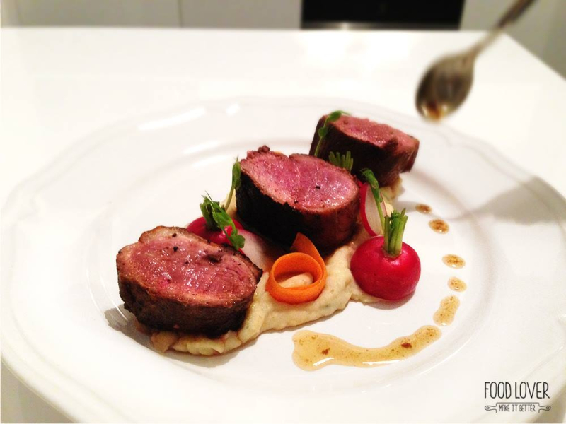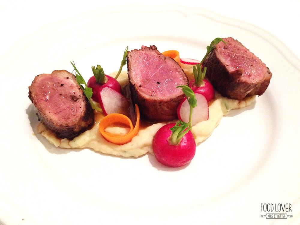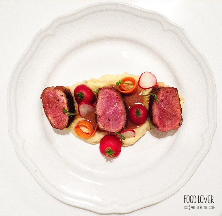 Troubu si rozpal na 190 stupňů. Kůži na prsou jemně nařízni, osol, opepři z obou stran a vlož kůží dolů na lehce rozpálenou suchou pánev. Až bude kůže dozlatova opečená (cca 8 min), nech zatáhnout ještě ze všech stran, slij si trochu výpeku na šťávu a dej cca na 8-10 min do trouby. Poté nech v zakryté míse odpočinout asi 5 minut. Vnitřní teplota by měla být kolem 61 stupňů – medium propečení. Část výpeku z pánve použij na přípravu šťávy – přilij trochu vývaru a nech pomalu zredukovat do hustší konzistence. Sundej z ohně a vmíchej kostičku másla – šťáva se hezky zahustí.