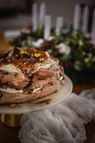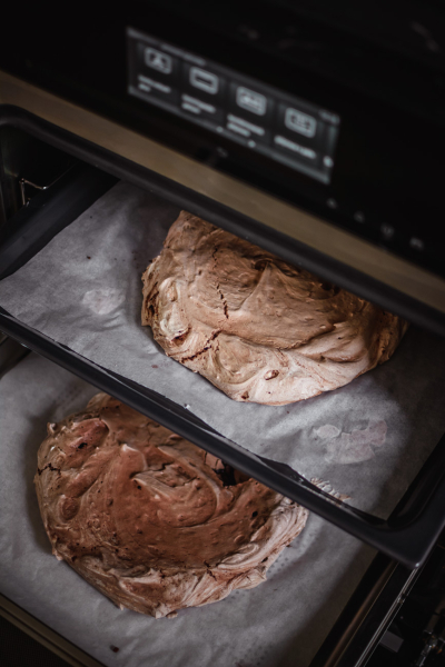 Bílky vložte do odmaštěné mísy a přidejte špetku soli. Šlehejte je v mixéru pomocí balónové metly (nebo ručním šlehačem) nejdříve na nižší otáčky, které postupně zvyšujte až na nejvyšší stupeň. Až bílky zbělají, začněte po lžících přidávat cukr krupici, šlehejte přitom téměř na nejvyšší stupeň. Až zašleháte všechen cukr, je potřeba směs ještě cca 7–10 minut šlehat, dokud nebudou bílky hladké, bez stopy cukrových krystalů. Minutu před koncem šlehání přidejte vanilkové aroma. Poté jen stěrkou opatrně vmíchejte směs škrobu a cukru moučka. Nakonec ledabyle vmíchejte kakao tak, aby vám v bílkové směsi zanechalo „mramorování“.