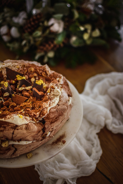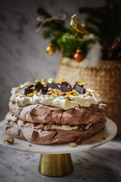 Až budou korpusy vystydlé, první opatrně přemístěte na dortový stojan či plochý talíř. Opatrně ho poklaďte ořechovým máslem tak, aby občas po straně vykouklo. Na máslo navrstvěte polovinu šlehačky a přidejte nasekané ořechy. Opatrně přikryjte druhou plackou a pokračujte stejným způsobem. Ozdobte čokoládou nalámanou na různě velké kousky (já jsem ještě použila jedlé zlato, ale není to potřeba samozřejmě :-)).