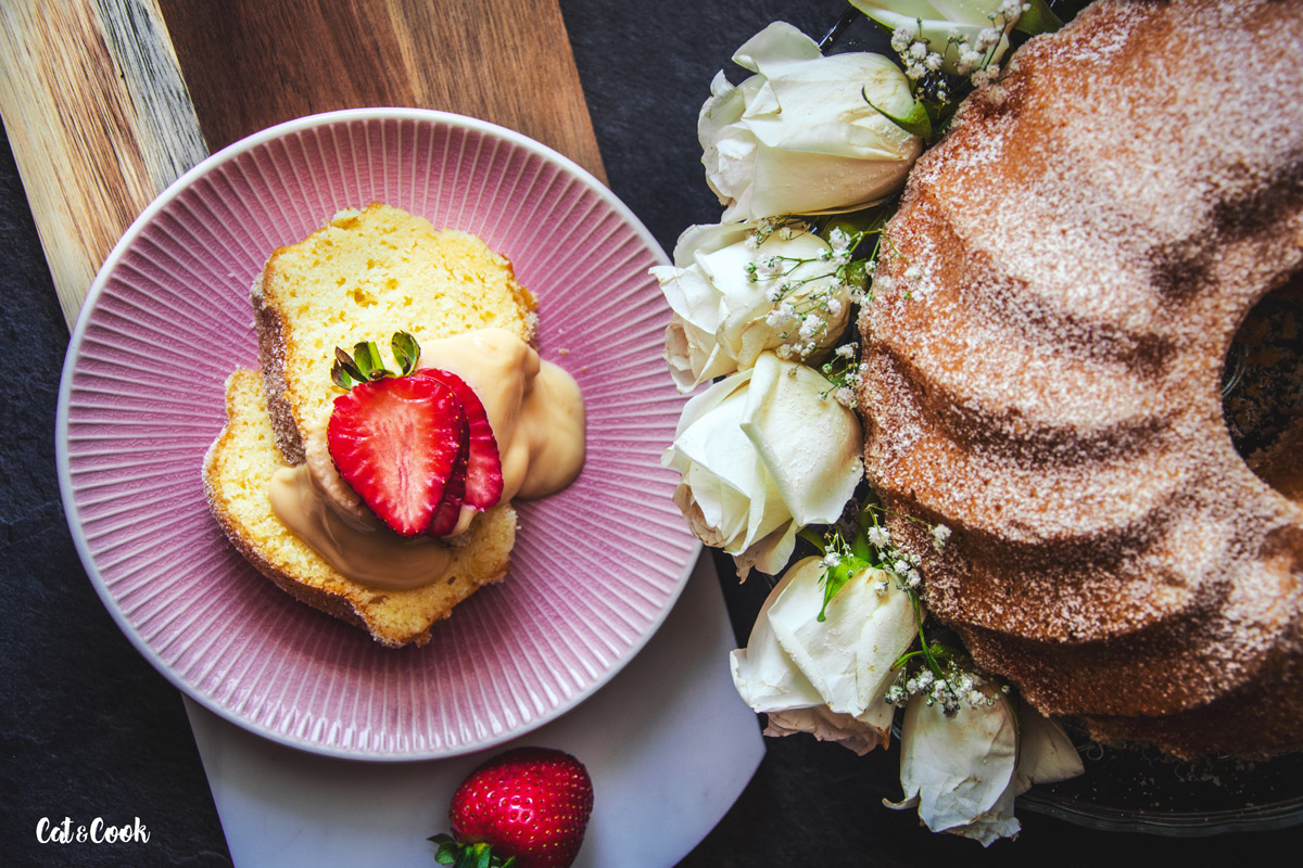 Až bude bábovka upečená, vyndejte ji z trouby a počkejte 2 – 3 minuty. Poté na otevřenou část položte talíř a pomocí utěrky a obou rukou ji na něj překlopte. Po vychladnutí ji pocukrujte moučkovým cukrem nebo polijte žloutkovým krémem „custard“. Záleží na vaší chuti.