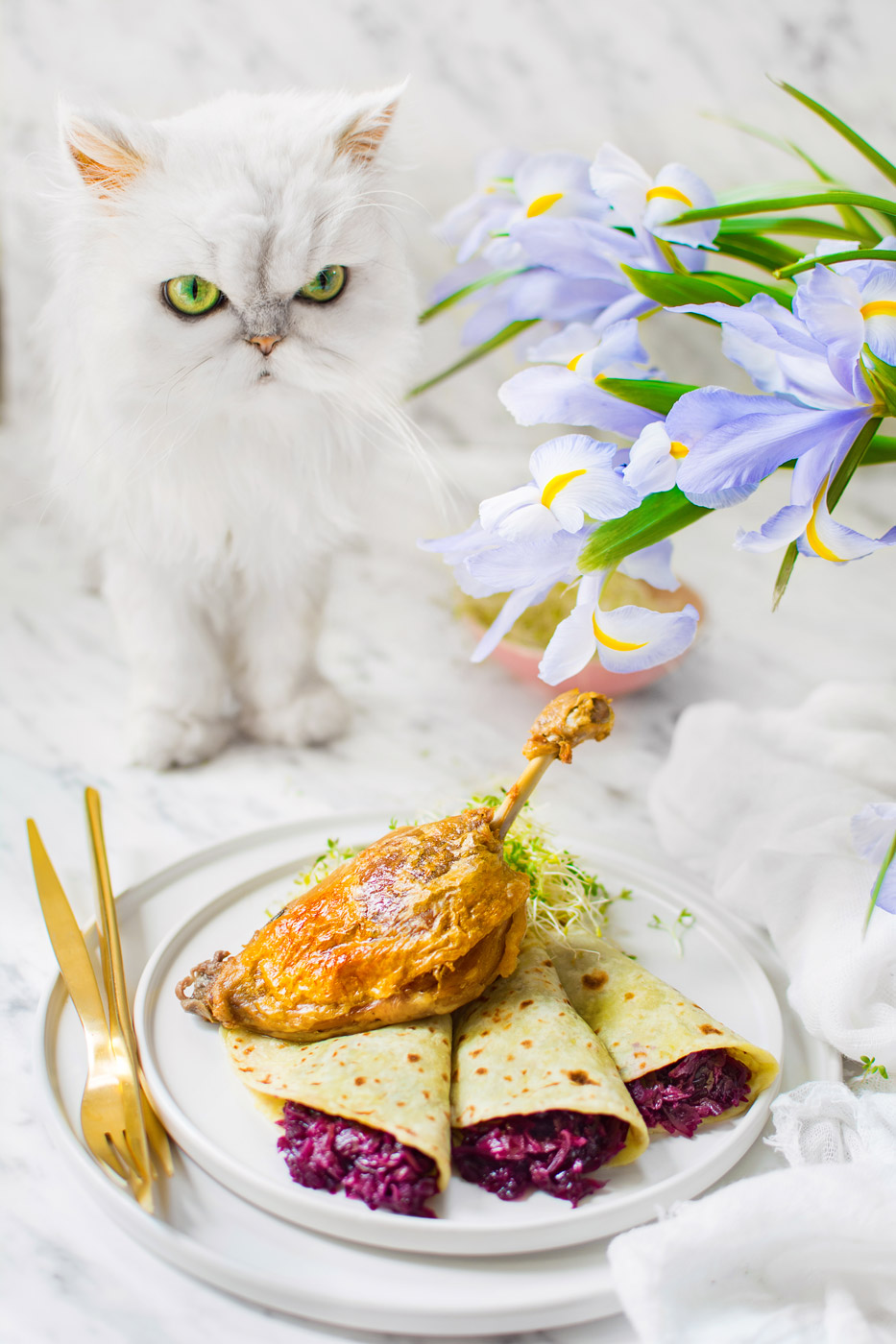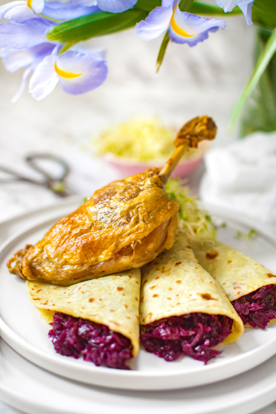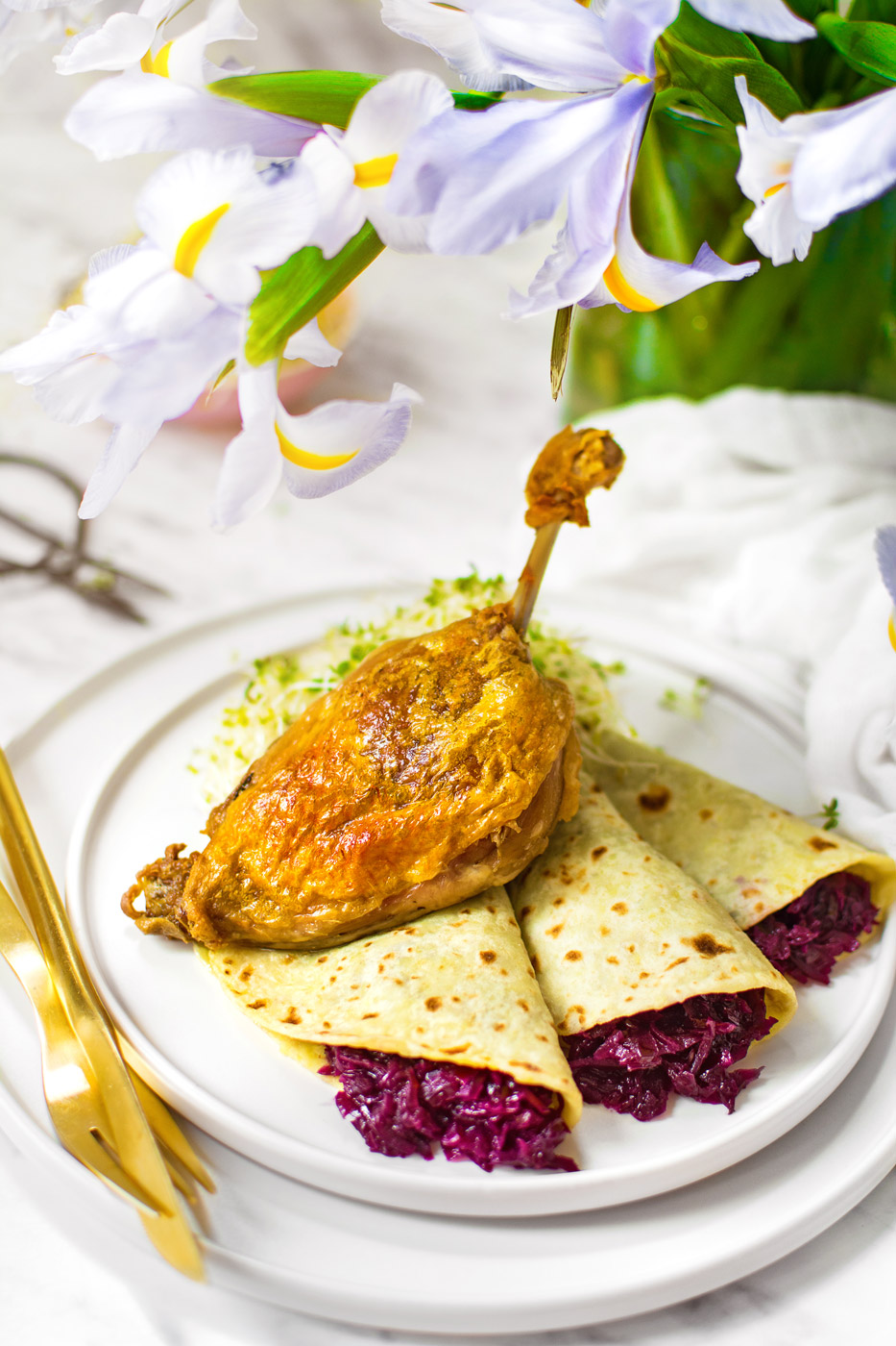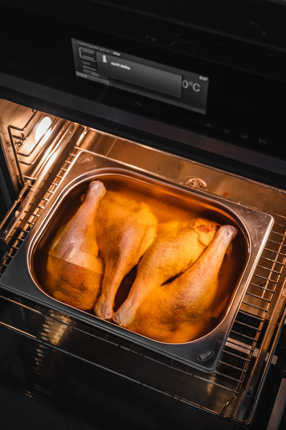 Po této době stehna vyndejte ze soli, omyjte a osušte. Připravte je do pekáčku / zapékací mísy s vyšším okrajem, kam se vejdou tak akorát. Důležité je, aby byla zcela ponořená, jinak by se maso vysušilo, proto podle toho zvolte správný typ nádoby. Troubu rozehřejte na 95 – 100 stupňů. Sádlo rozehřejte na plotně na stejnou teplotu. Zalijte stehna a vložte péct do trouby na 7 – 9 hodin (ideálně husu připravujte přes noc). Zda jsou stehna hotová, poznáte tak, že kost jde lehce oddělit od masa – ale upřímně, zkoušet to nemusíte, protože pokud vše dodržíte, bude to prostě bomba. 🙂 Po této době slijte téměř všechen tuk, ve kterém se husa konfitovala (pozor, slévejte velmi opatrně, protože husa se bude rozpadat). V pekáčku nechte asi jen 1 – 2 cm tuku. V troubě zapněte gril na co nejvyšší teplotu a stehna pod ním opečte dozlatova.