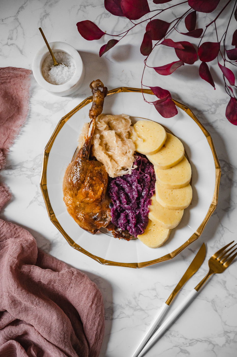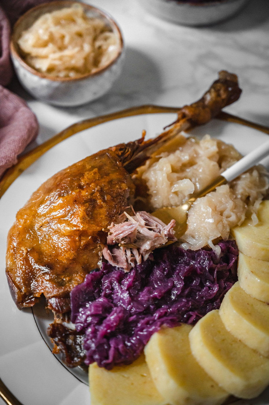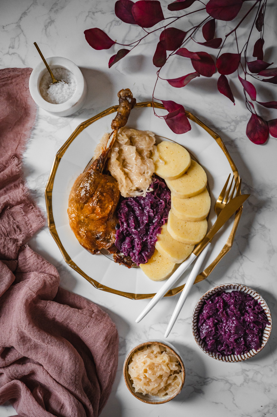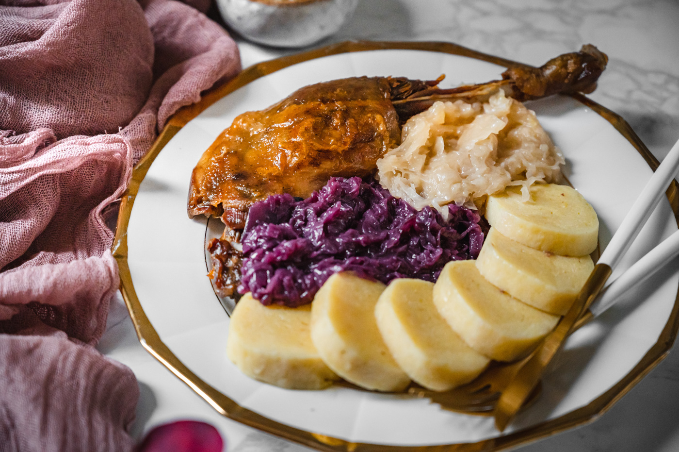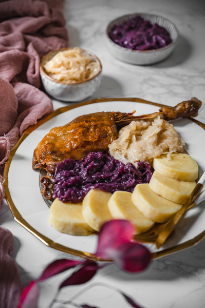 Zatímco se husa peče pod grilem, lokše naplňte zelím a připravte na talíř / nakrájejte knedlíky a připravte je na talír se zelím. Husu s opečenou kůžičkou položte na lokše / vedle knedlíků a zakápněte šťávou z pekáčku.