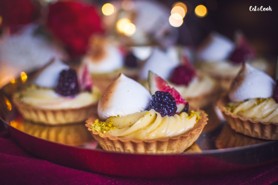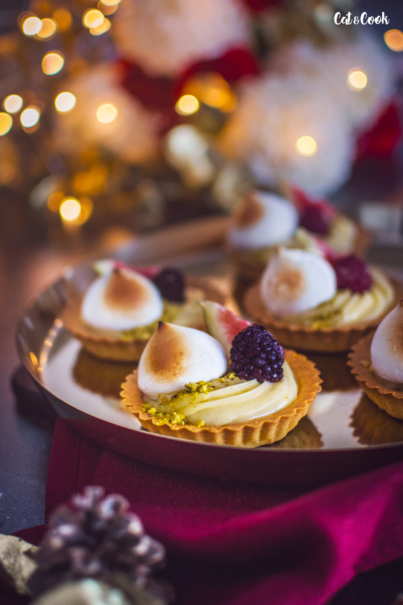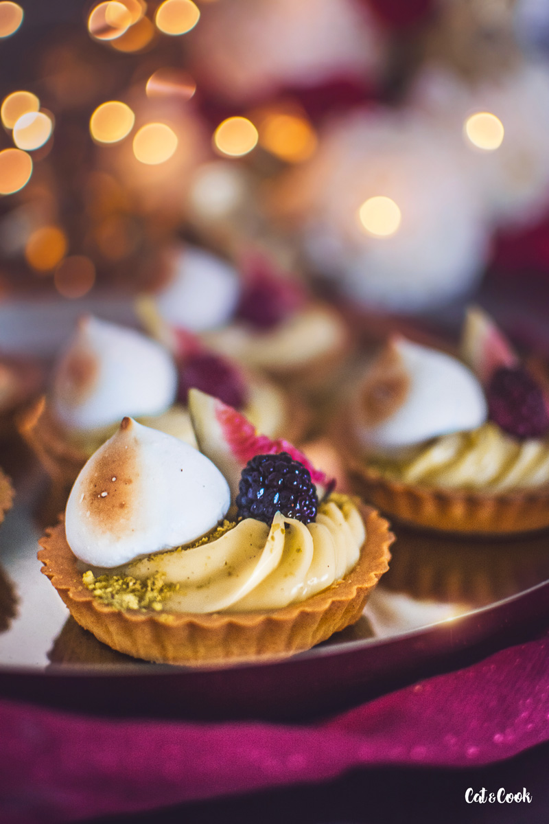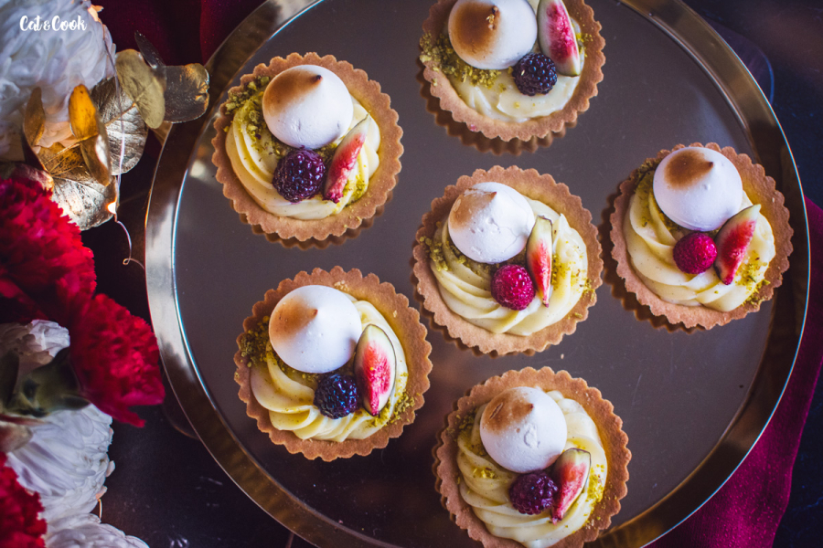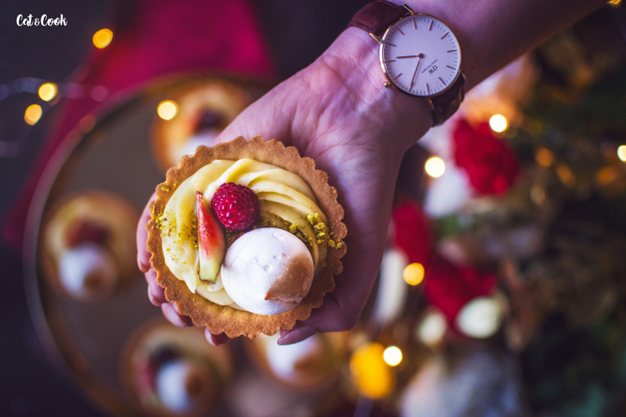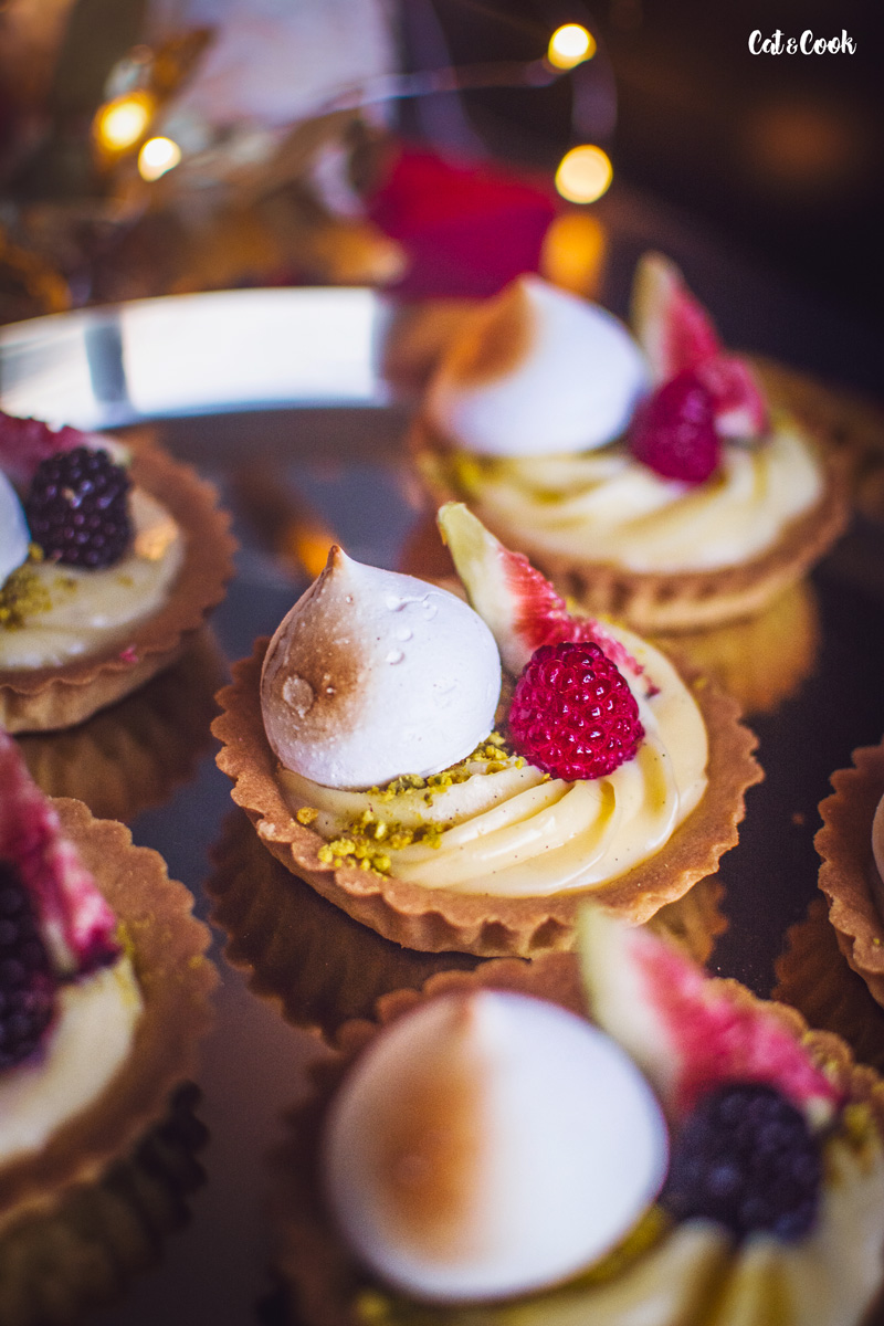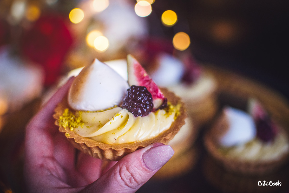 Chladný krém si připravte do zdobícího pytlíku s trezírovací špičkou a nastřikejte ho do tarteletek. Ty ozdobte pokrájenými fíky, ostružinami či malinami a pusinkou. Pokud máte doma flamovací pistolku, použijte ji na opálení pusinek, vytvoří to krásný efekt.