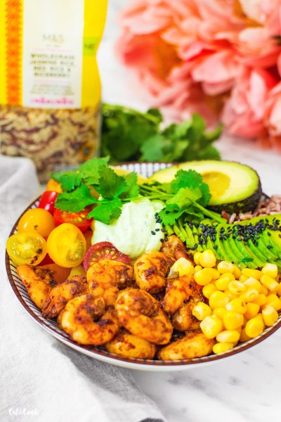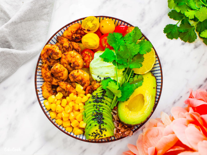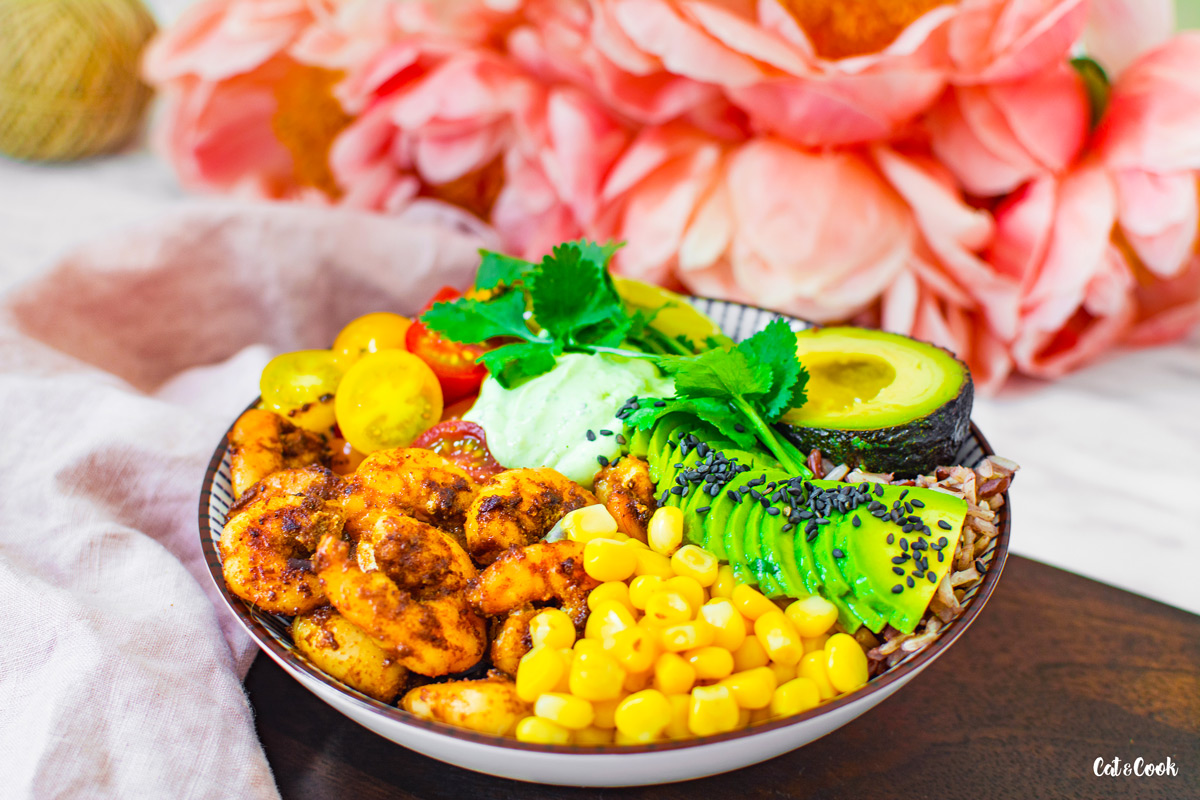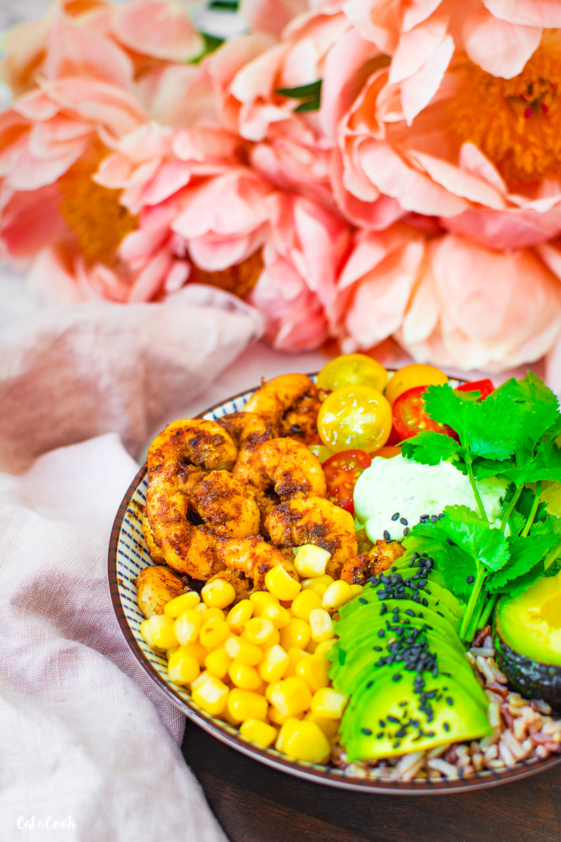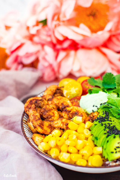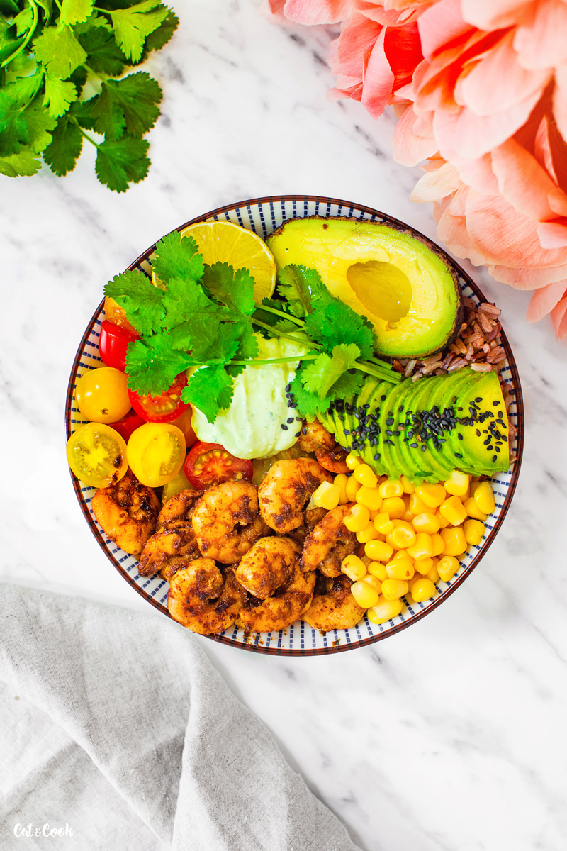 Na dno misky připravte rýži, kolem dokola naskládejte krevety, kukuřici, rajčátka, avokádo a doprostřed dip. Nakonec ozdobte koriandrem a máte hotovo.