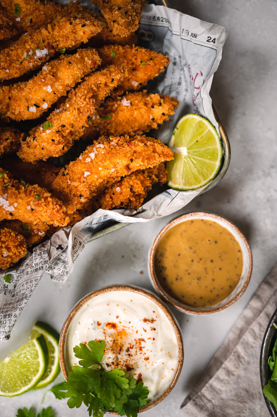 Stripsy můžete podávat s bramborovou kaší nebo třeba samotné s dipem. Já jsem připravila česnekový dip ze zakysané smetany a majonézy s jarní cibulkou a hořčičný dip s medem. 🙂