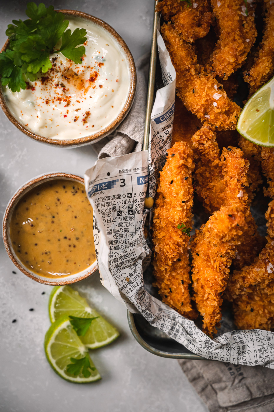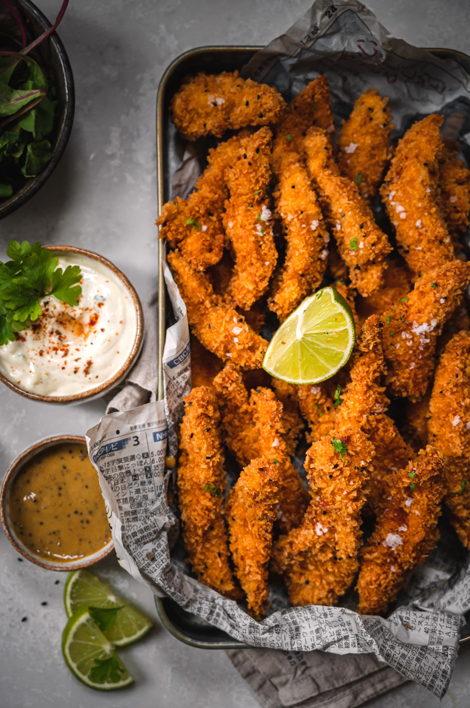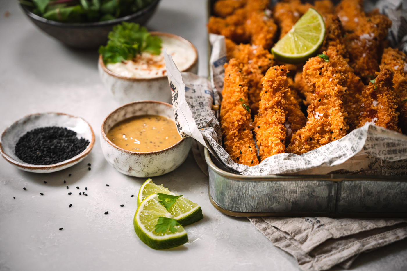 Na kuřecí stripsy můžete použít i stehenní řízky, které jsou šťavnatější, záleží na vaší chuti. Panko strouhanka je japonský druh strouhanky. Vyrábí se ze světlého pečiva bez kůrky a má hrubší strukturu, než jsme zvyklí u české strouhanky. Díky hrubé struktuře nenasává tolik tuku a výsledný pokrm krásně křupe. Koupíte ji téměř v každém supermarketu. Nigella neboli černucha je moje oblíbené koření. Hojně se používá v Indii, pokud jste někdy jedli indický naan, možná jste ho na něm ochutnali. 🙂 V Čechách se s ním občas sype celozrnné pečivo. Dá se koupit např. v prodejnách M&S, u Antonína či v asijských obchodech a e-shopech.